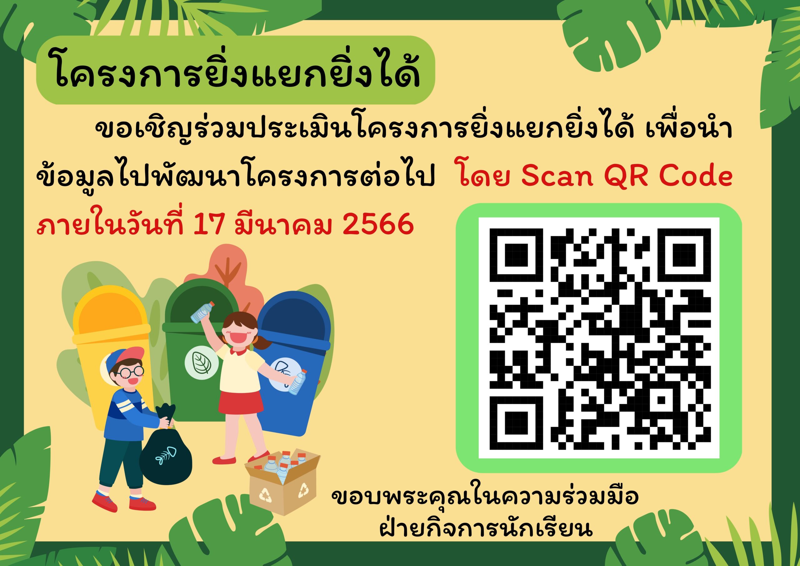 ขอความกรุณาผู้ปกครองนักเรียนร่วมตอบแบบประเมิน “โครงการยิ่งแยกยิ่งได้” เพื่อนำข้อมูลมาปรับปรุงและพัฒนาโครงการให้เหมาะสมยิ่งขึ้นต่อไป