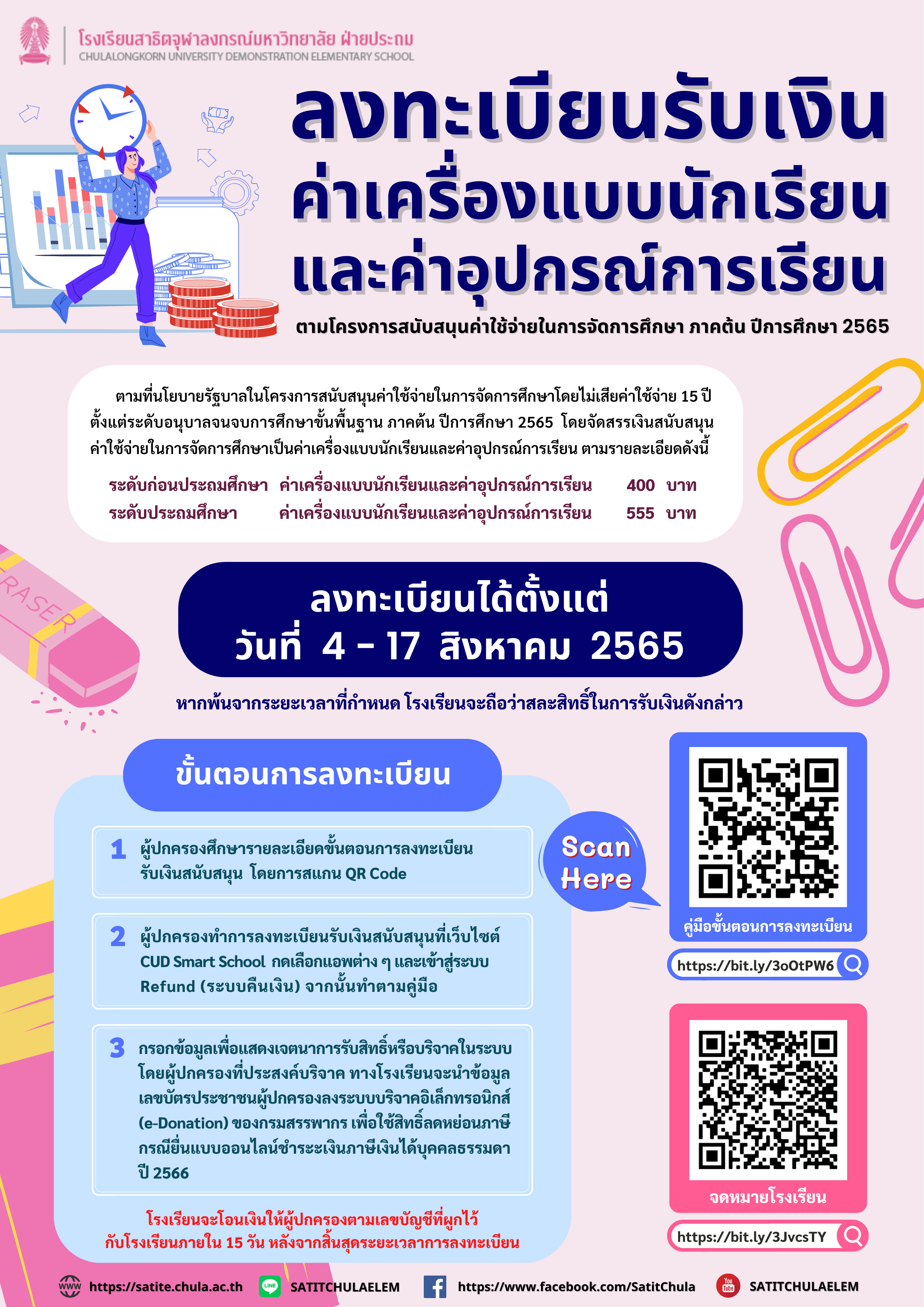 2. ผู้ปกครองลงทะเบียนรับสิทธิ์ค่าเครื่องแบบนักเรียนและค่าอุปกรณ์การเรียน ที่เว็บไซต์ CUD Smart School กดเลือกแอพต่าง ๆ เข้าสู่ระบบ CUD Refund (ระบบคืนเงิน) จากนั้นทำตามคู่มือที่แนบมา ได้ตั้งแต่วันที่ 4 -17 สิงหาคม 2565 ทั้งนี้ จะโอนเงินให้ผู้ปกครองตามเลขบัญชีที่ผูกไว้กับโรงเรียน ภายใน 15 วัน หลังจากสิ้นสุดระยะเวลาการลงทะเบียน จึงขอความร่วมมือผู้ปกครองดำเนินการตามระยะเวลาที่กำหนดหากพ้นจากระยะเวลาดังกล่าว โรงเรียนจะถือว่าสละสิทธิ์ในการรับเงินค่าเครื่องแบบนักเรียนและค่าอุปกรณ์การเรียน