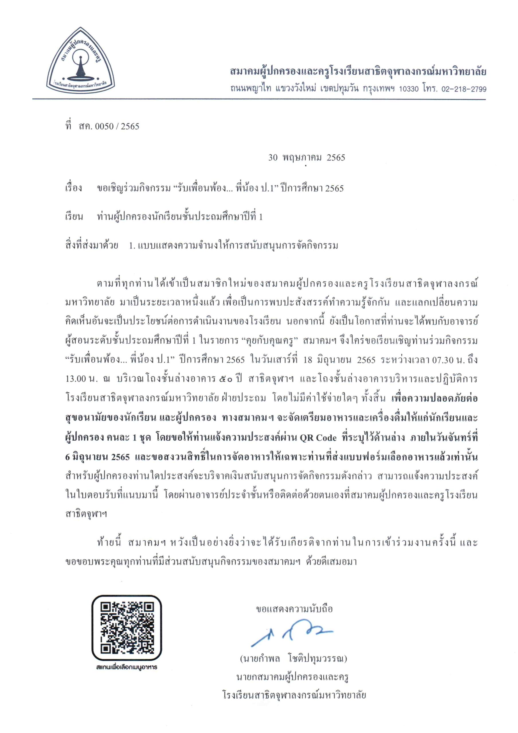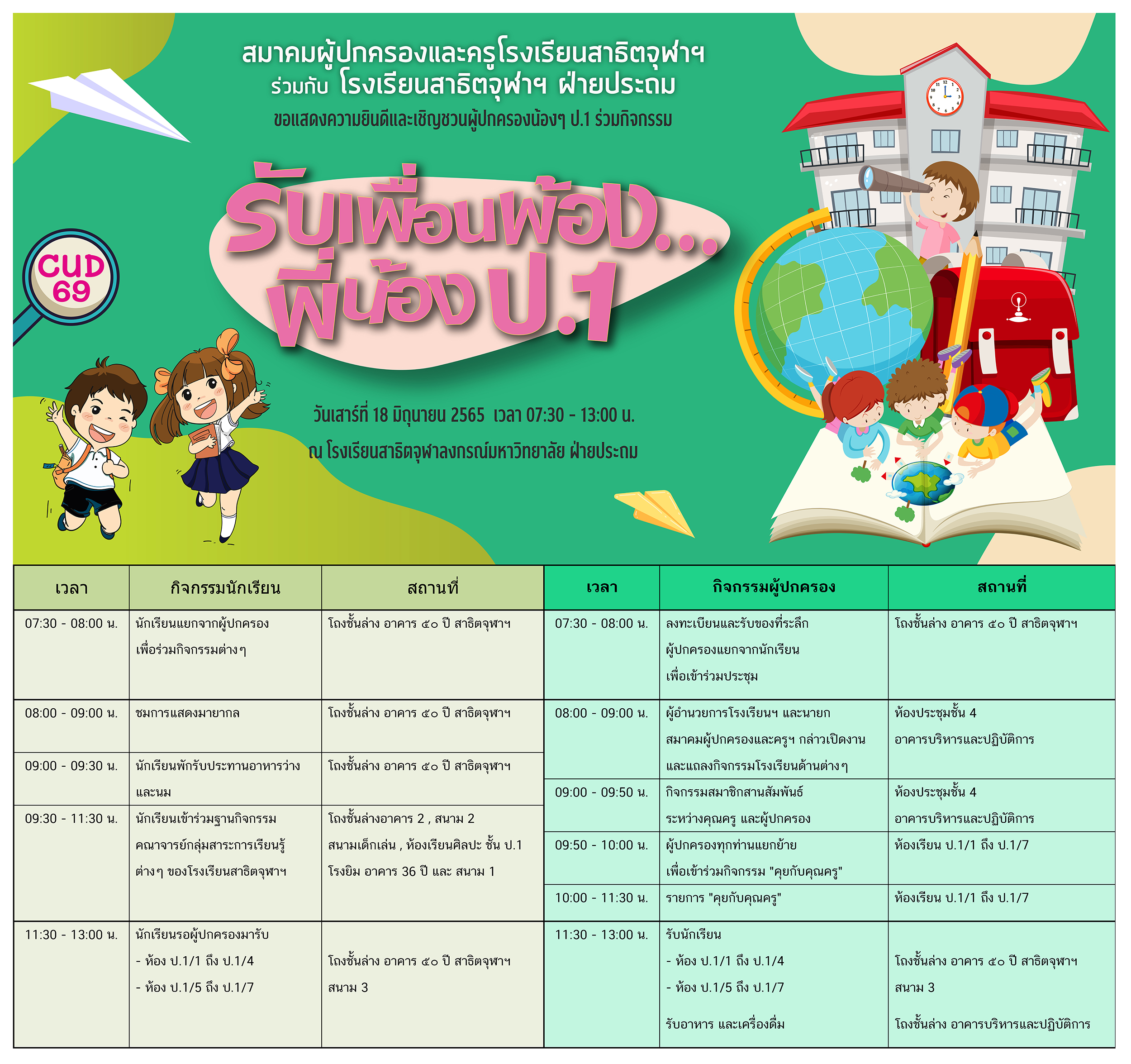 ตามที่ทุกท่านได้เข้าเป็นสมาชิกใหม่ของสมาคมผู้ปกครองและครูโรงเรียนสาธิตจุฬาลงกรณ์มหาวิทยาลัย มาเป็นระยะเวลาหนึ่งแล้ว เพื่อเป็นการพบปะสังสรรค์ทำความรู้จักกัน และแลกเปลี่ยนความคิดเห็นอันจะเป็นประโยชน์ต่อการดำเนินงานของโรงเรียน นอกจากนี้ ยังเป็นโอกาสที่ท่านจะได้พบกับอาจารย์ผู้สอนระดับชั้นประถมศึกษาปีที่ 1 ในรายการ “คุยกับคุณครู” สมาคมฯ จึงใคร่ขอเรียนเชิญท่านร่วมกิจกรรม “รับเพื่อนพ้อง… พี่น้อง ป.1” ปีการศึกษา 2565 ในวันเสาร์ที่ 18 มิถุนายน 2565 ระหว่างเวลา 07.30 น. – 13.00 น. ณ บริเวณโถงชั้นล่างอาคาร ๕๐ ปี สาธิตจุฬาฯ และโถงชั้นล่างอาคารบริหารและปฏิบัติการ โรงเรียนสาธิตจุฬาลงกรณ์มหาวิทยาลัย ฝ่ายประถม โดยไม่มีค่าใช้จ่ายใด ๆ ทั้งสิ้น