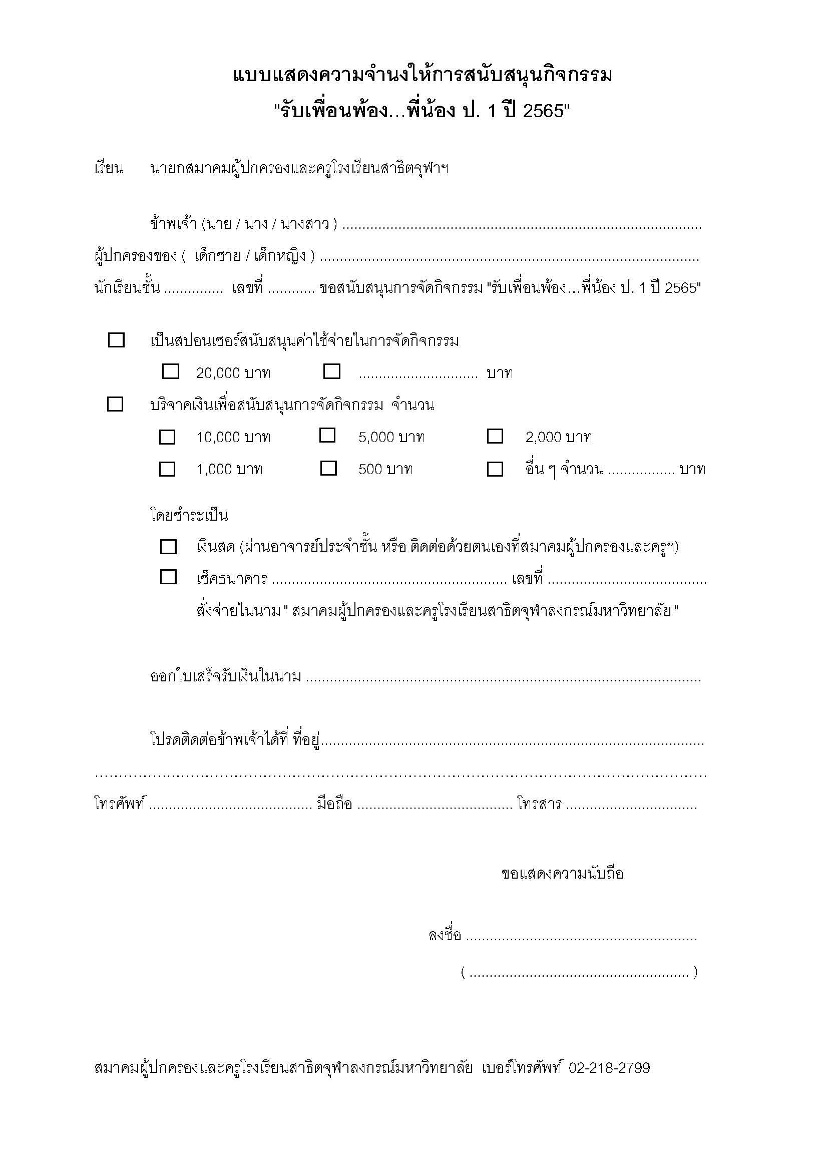 สำหรับผู้ปกครองท่านใดประสงค์จะบริจาคเงินสนับสนุนการจัดกิจกรรมดังกล่าว สามารถแจ้งความประสงค์ในใบตอบรับที่แนบมานี้ โดยผ่านอาจารย์ประจำชั้นหรือติดต่อด้วยตนเองที่สมาคมผู้ปกครองและครูโรงเรียนสาธิตจุฬาฯ
