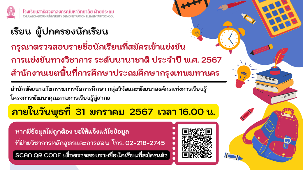 ประกาศรายชื่อนักเรียนที่ได้รับคัดเลือกให้เข้าเรียน หลักสูตร CUD ALTERNATIVE PROGRAM ระดับชั้นประถมศึกษาปีที่ 2 ปีการศึกษา 2567 โรงเรียนสาธิตจุฬาลงกรณ์มหาวิทยาลัย ฝ่ายประถม