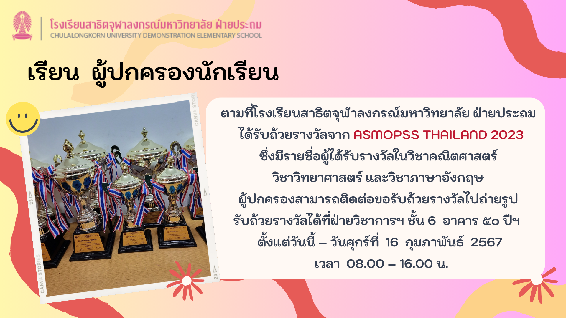ผู้ปกครองนักเรียนโรงเรียนสาธิตจุฬาลงกรณ์มหาวิทยาลัย ฝ่ายประถม ผู้ปกครองสามารถดูคะแนนผลการเรียนของนักเรียนระดับชั้นประถมศึกษาปีที่ 1 – 6 ประจำภาคปลาย ครั้งที่ 1 ปีการศึกษา 2566 ในระบบ CUD SMART SCHOOL โดยสามารถใช้ Username และ Password ของท่าน ได้ตั้งแต่วันจันทร์ที่ 22 มกราคม 2567 เวลา 09.00 น. เป็นต้นไป
