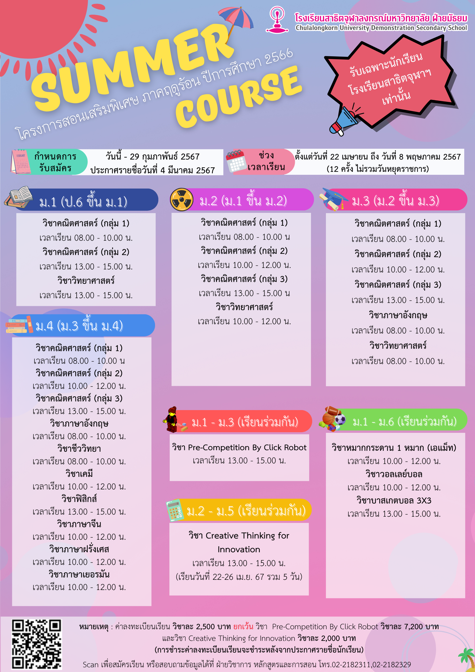 โครงการสอนเสริมพิเศษ ภาคฤดูร้อน ปีการศึกษา 2566 และโครงการเตรียมความพร้อม ม.1 ปีการศึกษา 2566 โรงเรียนสาธิตจุฬาลงกรณ์มหาวิทยาลัย ฝ่ายมัธยม ขอประชาสัมพันธ์เชิญชวนนักเรียนระดับชั้นประถมศึกษาปีที่ 6 ปีการศึกษา 2566 ที่สนใจสมัครเข้าร่วมโครงการภายในวันที่กำหนด
