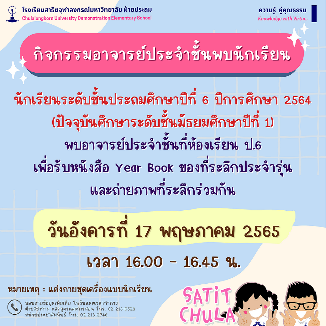 เรื่อง ขอนัดหมายนักเรียนชั้นประถมศึกษาปีที่ 6 ปีการศึกษา 2564 เพื่อเข้าร่วมกิจกรรมอาจารย์ประจำชั้นพบนักเรียน By Web Master|2022-05-13T15:10:14+07:00May 13, 2022|ข่าวประชาสัมพันธ์| View Larger Image