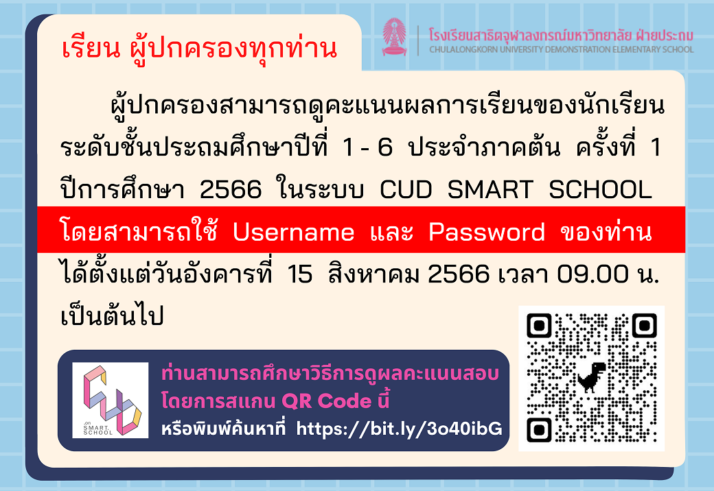 ผู้ปกครองสามารถดูคะแนนผลการเรียนของนักเรียนระดับชั้นประถมศึกษาปีที่ 1 – 6 ประจำภาคต้น ครั้งที่ 1 ปีการศึกษา 2566 ในระบบ CUD SMART SCHOOL โดยสามารถใช้ Username และ Password ของท่าน ได้ตั้งแต่วันอังคารที่ 15 สิงหาคม 2566 เวลา 09.00 น. เป็นต้นไป