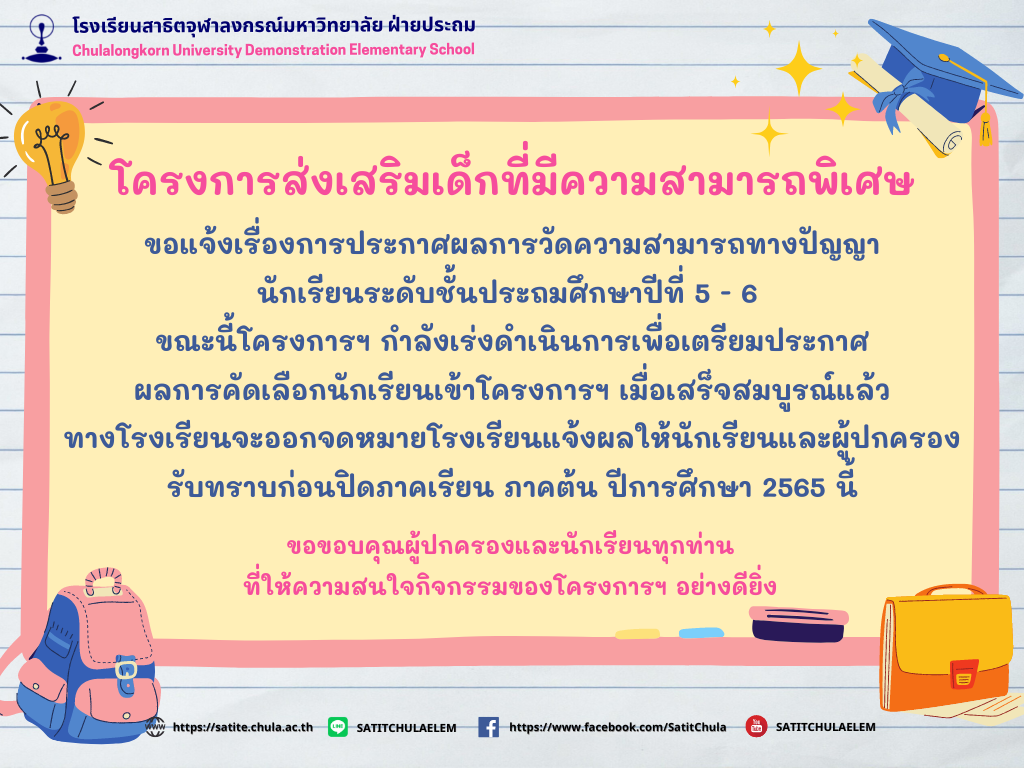 การประกาศผลการวัดความสามารถทางปัญญา นักเรียนระดับชั้นประถมศึกษาปีที่ 5 – 6 เข้าโครงการส่งเสริมเด็กที่มีความสามารถพิเศษ ปีการศึกษา 2565 By Web Master|2022-09-12T11:09:53+07:00September 12, 2022|ข่าวประชาสัมพันธ์| View Larger Image