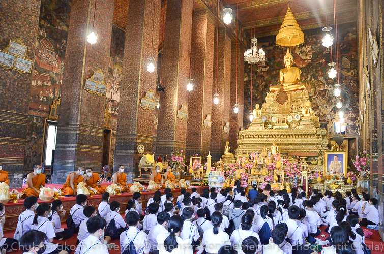 จากนั้นรถแห่เทียนพรรษานำขบวนคณะไปยังวัดพระเชตุพนวิมลมังคลารามราชวรมหาวิหาร (วัดโพธิ์) ประกอบพิธีแห่เทียนพรรษา ณ รอบพระอุโบสถ นมัสการพระสงฆ์ จำนวน 9 รูป ในการถวายเทียนจำนำพรรษา ถวายเครื่องสักการะบูชา ดอกไม้ ธูปเทียน และอัฐบริขาร นอกจากนี้ทางโรงเรียนได้จัดให้นักเรียนและคณาจารย์เข้าชมพระตำหนักวาสุรีและเยี่ยมชมเขตพุทธาวาสเพื่อให้นักเรียนมีโอกาสได้รับความรู้เกี่ยวกับประวัติความเป็นมาของวัดพระเชตุพนวิมลมังคลารามราชวรมหาวิหาร (วัดโพธิ์) และเรียนรู้ประเพณีการทำบุญในพระพุทธศาสนา โดยเฉพาะการถวายเทียนจำนำพรรษาอย่างใกล้ชิดและเป็นประสบการณ์ตรงของนักเรียนเอง