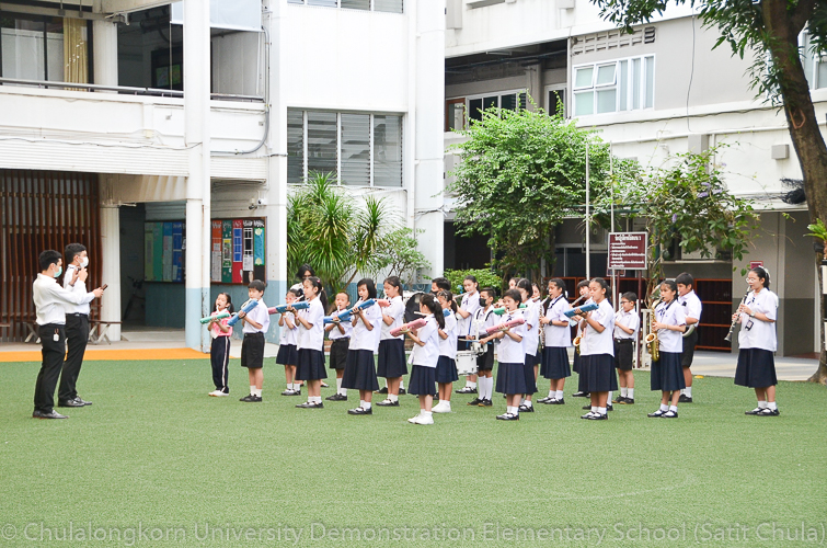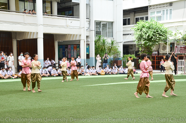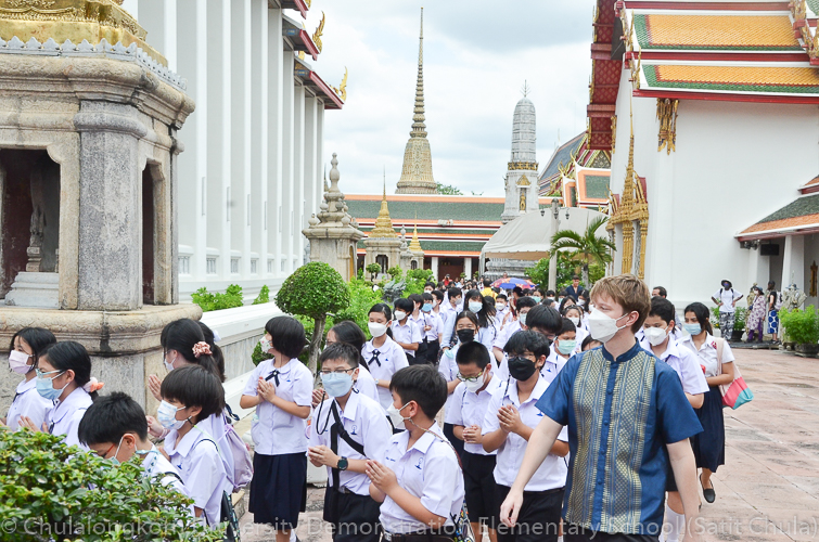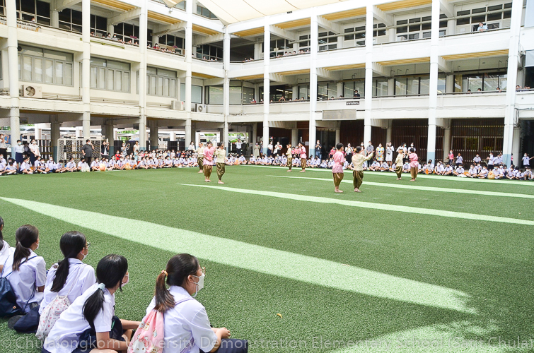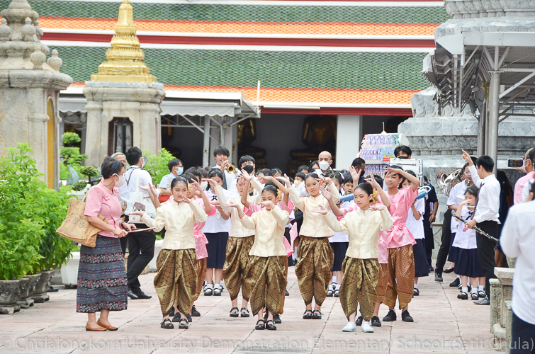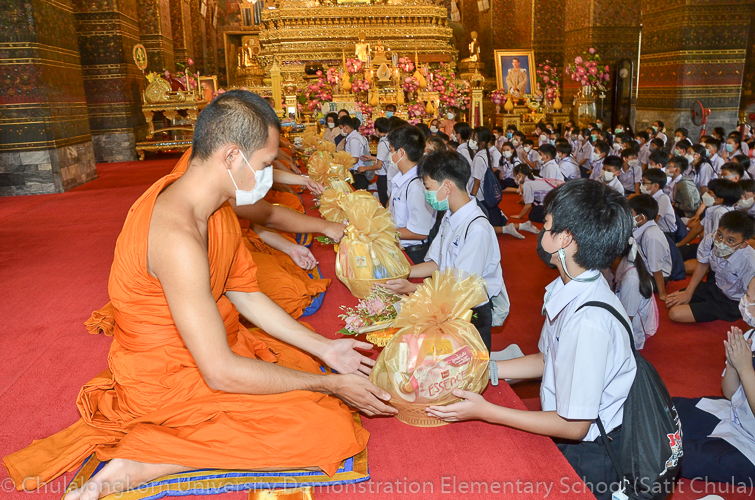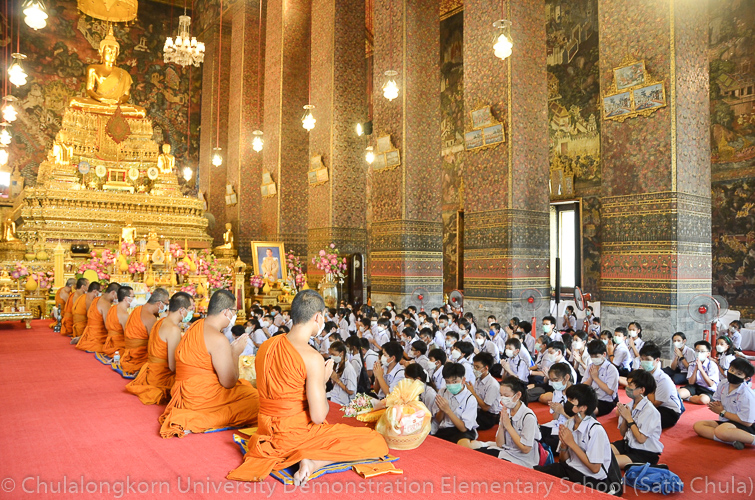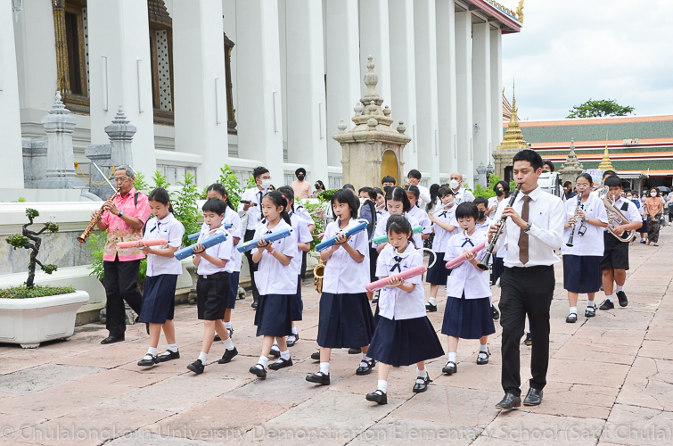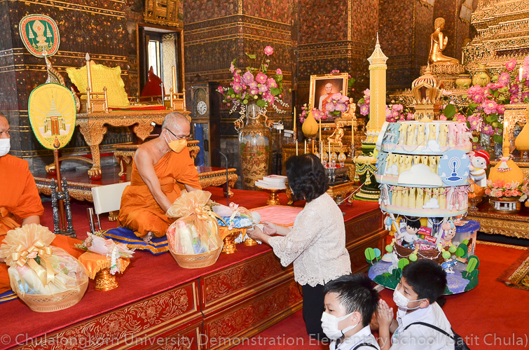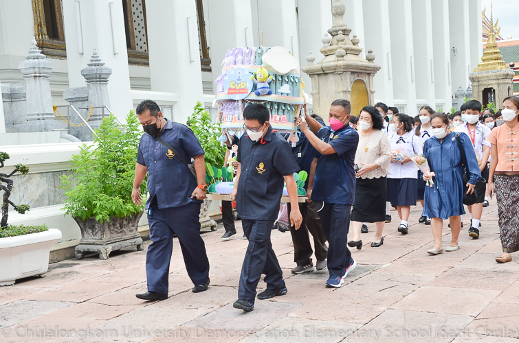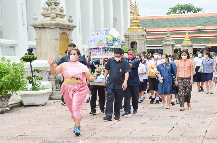 จากนั้นในช่วงเที่ยง โรงเรียนสาธิตจุฬาลงกรณ์มหาวิทยาลัย ฝ่ายประถม นำโดย รศ.พัชรี วรจรัสรังสี ผู้อำนวยการโรงเรียนสาธิตจุฬาฯ ฝ่ายประถม และรองคณบดีคณะครุศาสตร์ เป็นประธาน พร้อมด้วยคณาจารย์ บุคลากร และนักเรียนระดับชั้นประถมศึกษาปีที่ 6 ตั้งขบวนรถแห่เทียนพรรษาเพื่อไปนำถวายเทียนจำนำพรรษา ณ วัดพระเชตุพนวิมลมังคลารามราชวรมหาวิหาร (วัดโพธิ์) โดยก่อนเดินทางไปยังวัด กลุ่มสาระการเรียนรู้ดนตรี – นาฏศิลป์ ได้จัดการแสดงประกอบขบวนแห่เทียนพรรษา ให้คณาจารย์ บุคลากร และนักเรียนทุกระดับได้รับชมศิลปะการฟ้อนรำและการแสดงดนตรีที่สนุกสนานครึกครื้น อันเป็นการอนุรักษ์ สืบทอด และส่งเสริมประเพณีวัฒนธรรมไทย
