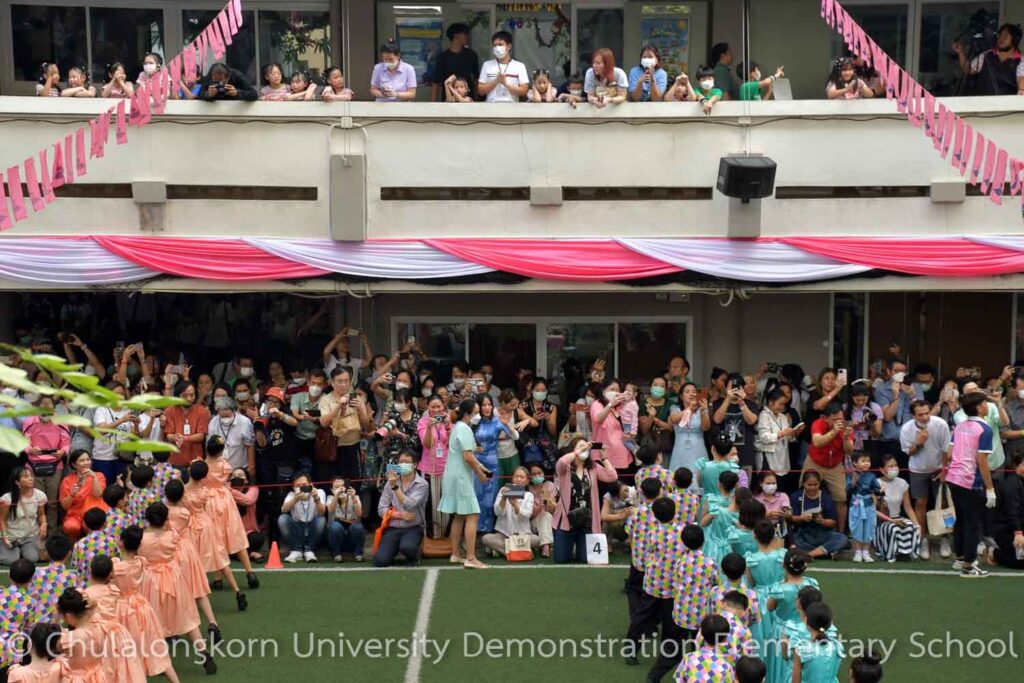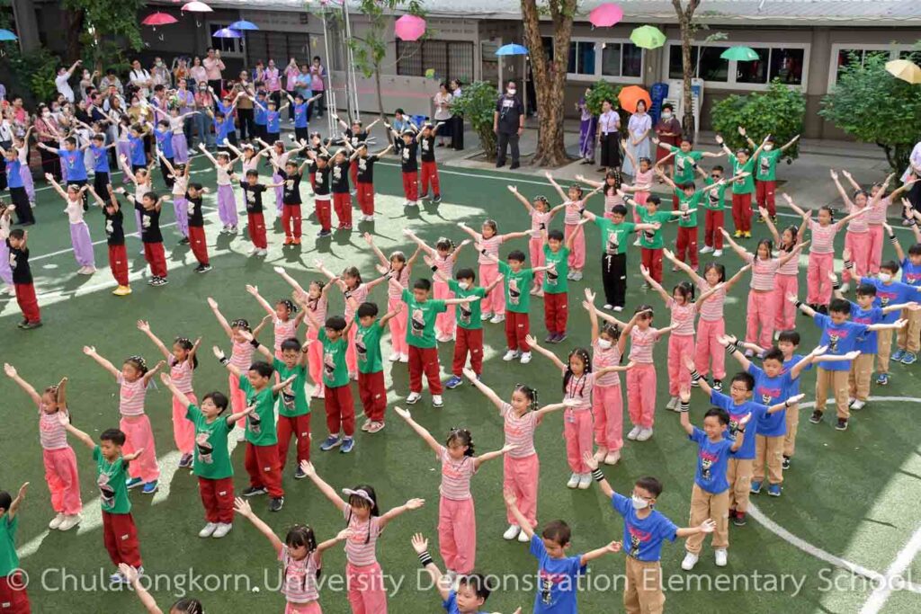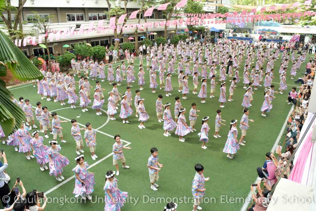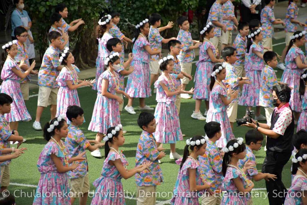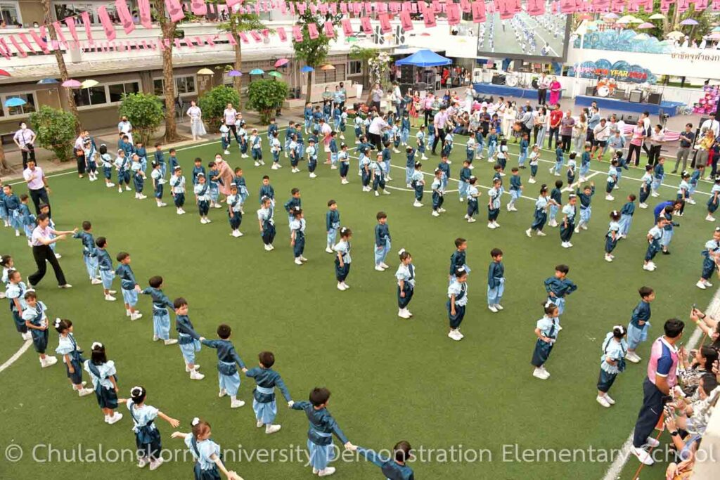 2.ภาพการแสดงรายการที่ 2 ของนักเรียนระดับชั้นประถมศึกษาปีที่ 1 ชื่อชุดการแสดง “สาธิตจุฬาฯ หัวใจไทย” กิจกรรมต้อนรับปีใหม่ 2567 “สาธิตจุฬาฯ สุขี ฤกษ์ดีปีมะโรง”