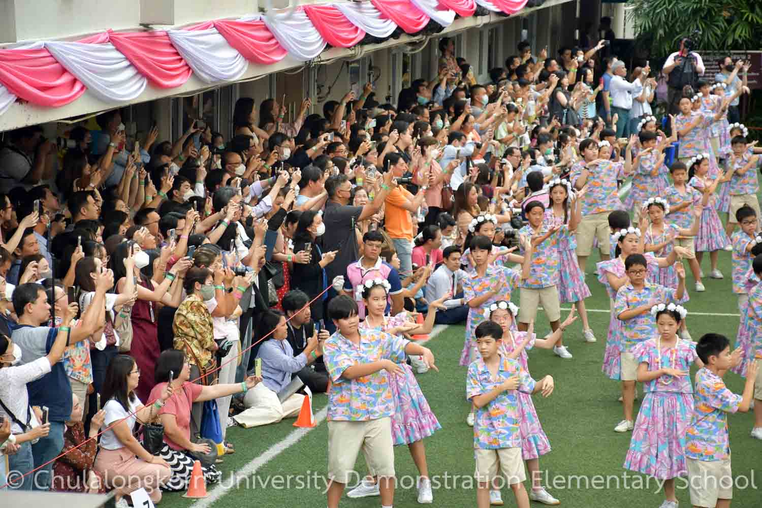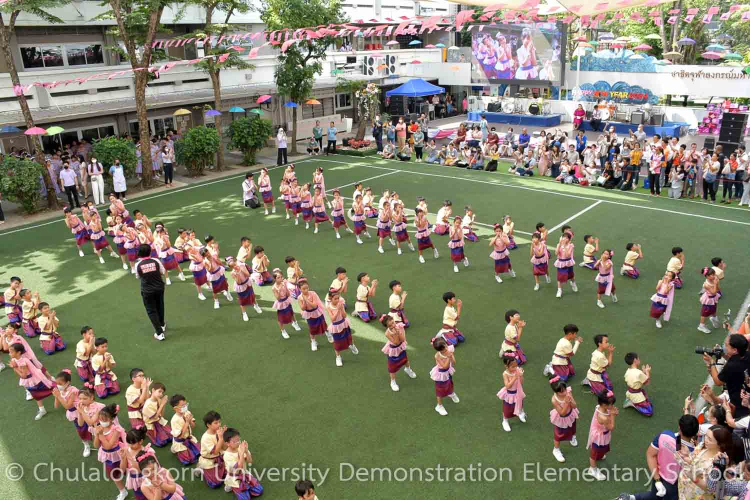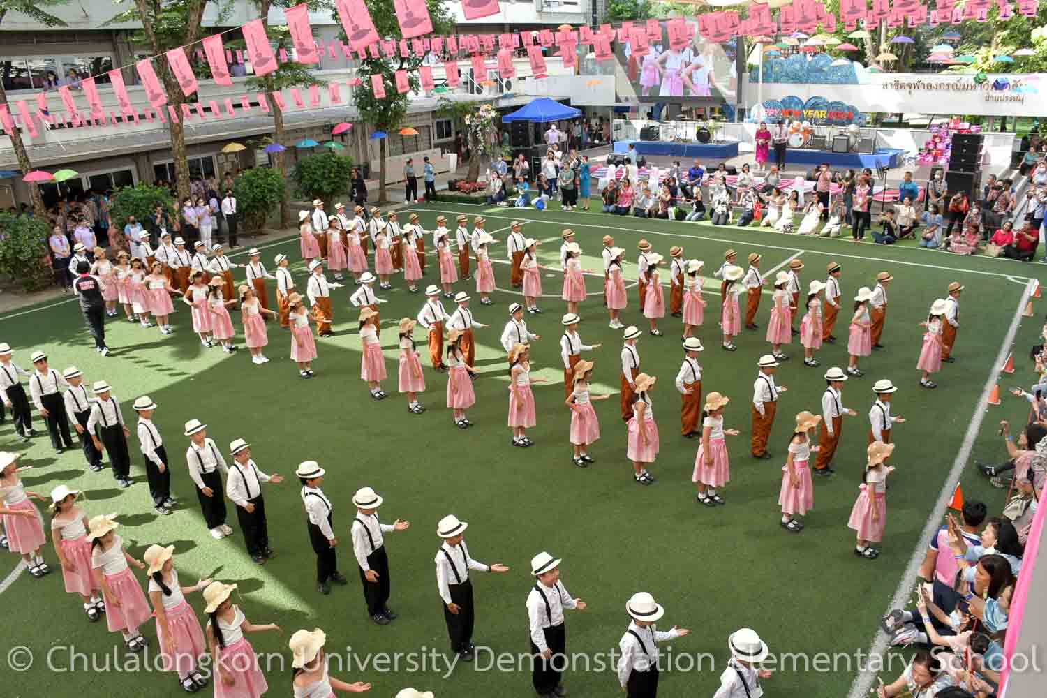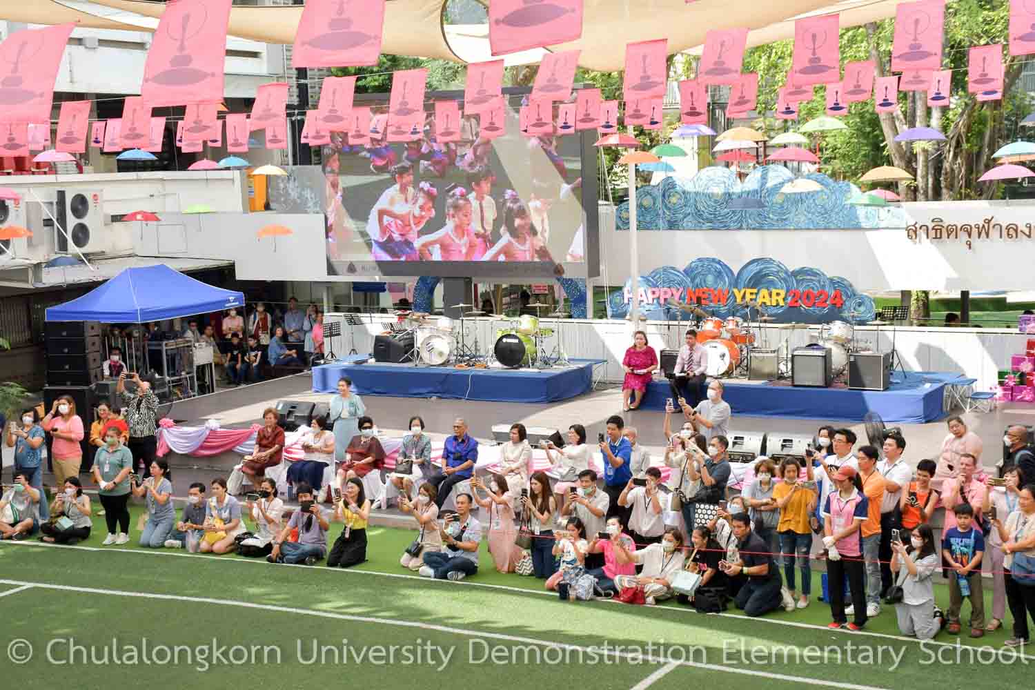 2.ภาพการแสดงรายการที่ 2 ของนักเรียนระดับชั้นประถมศึกษาปีที่ 1 ชื่อชุดการแสดง “สาธิตจุฬาฯ หัวใจไทย” กิจกรรมต้อนรับปีใหม่ 2567 “สาธิตจุฬาฯ สุขี ฤกษ์ดีปีมะโรง”