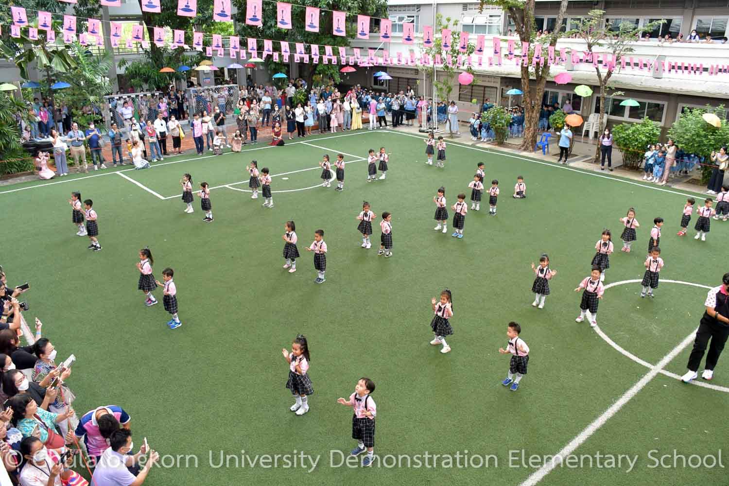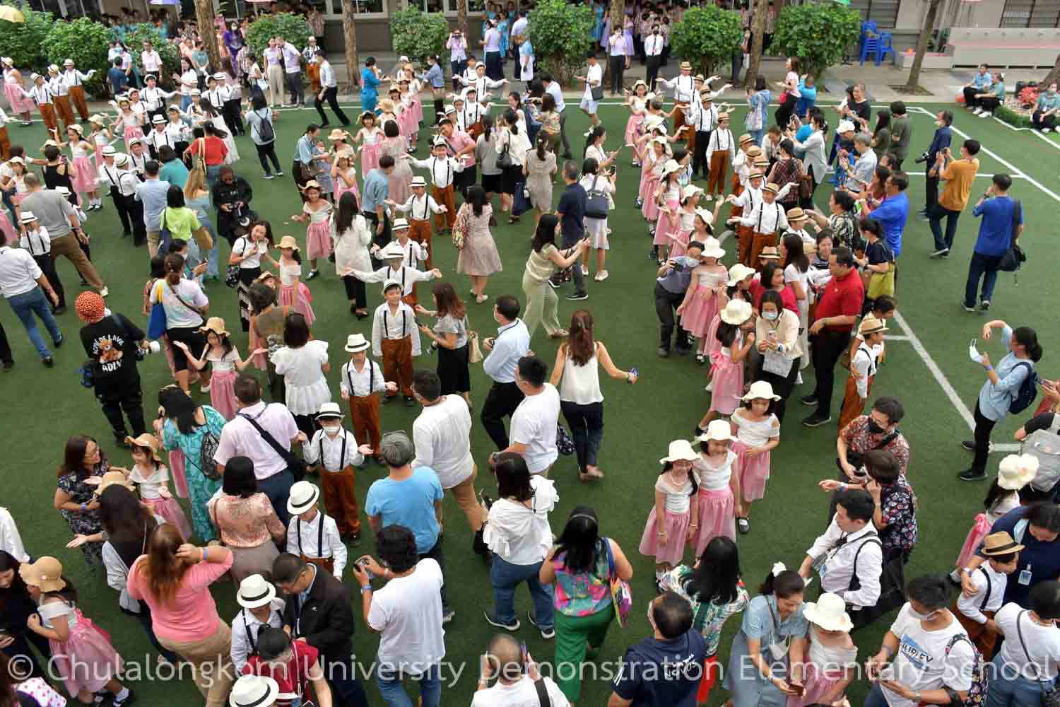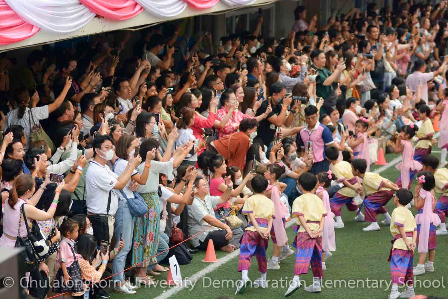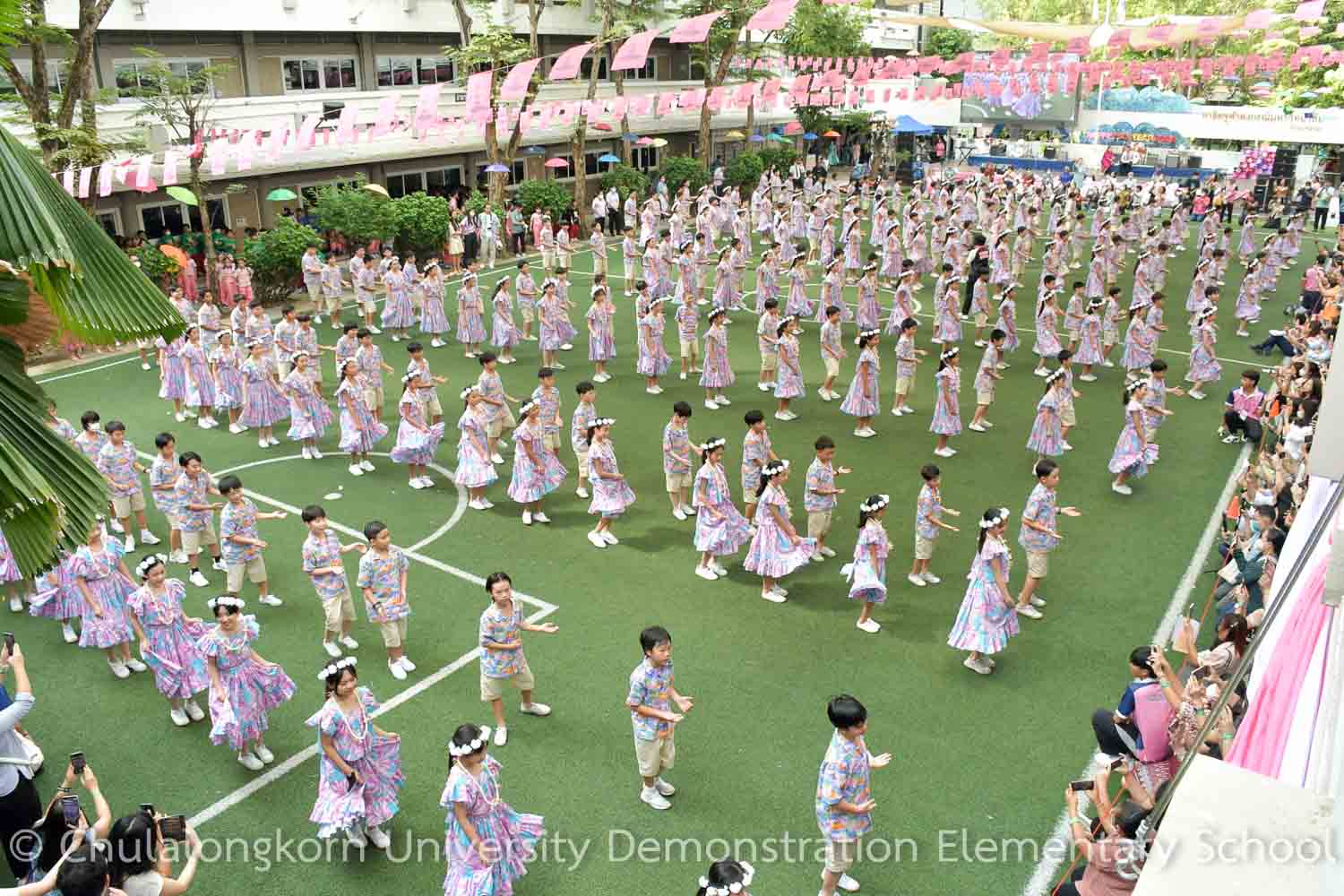 2.ภาพการแสดงรายการที่ 2 ของนักเรียนระดับชั้นประถมศึกษาปีที่ 1 ชื่อชุดการแสดง “สาธิตจุฬาฯ หัวใจไทย” กิจกรรมต้อนรับปีใหม่ 2567 “สาธิตจุฬาฯ สุขี ฤกษ์ดีปีมะโรง”