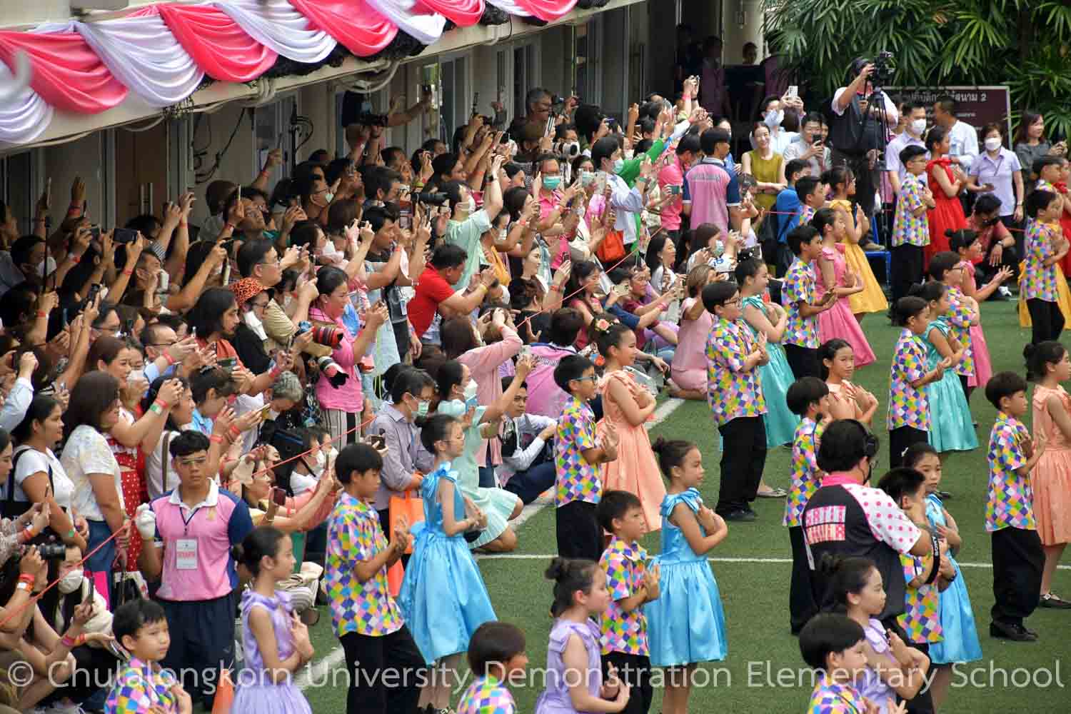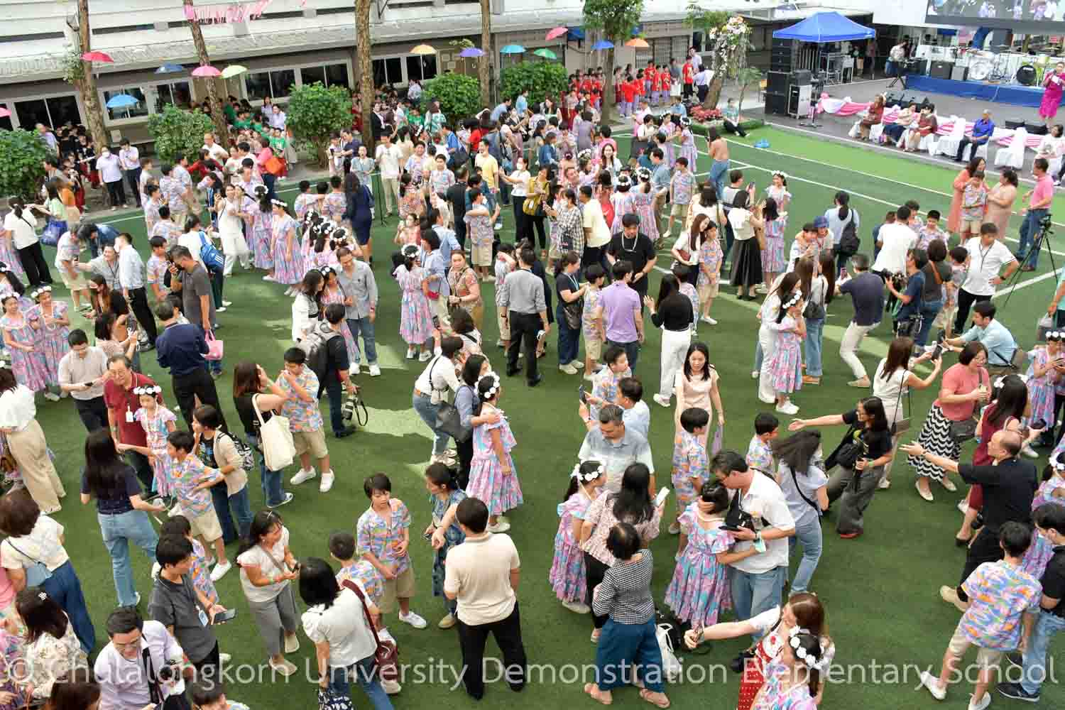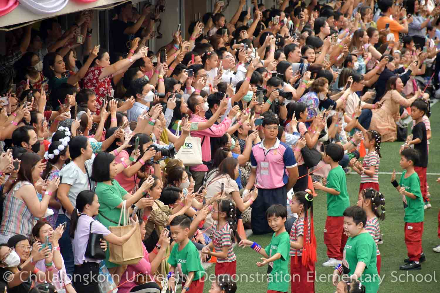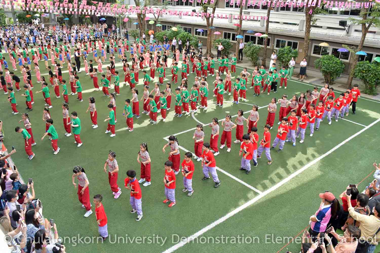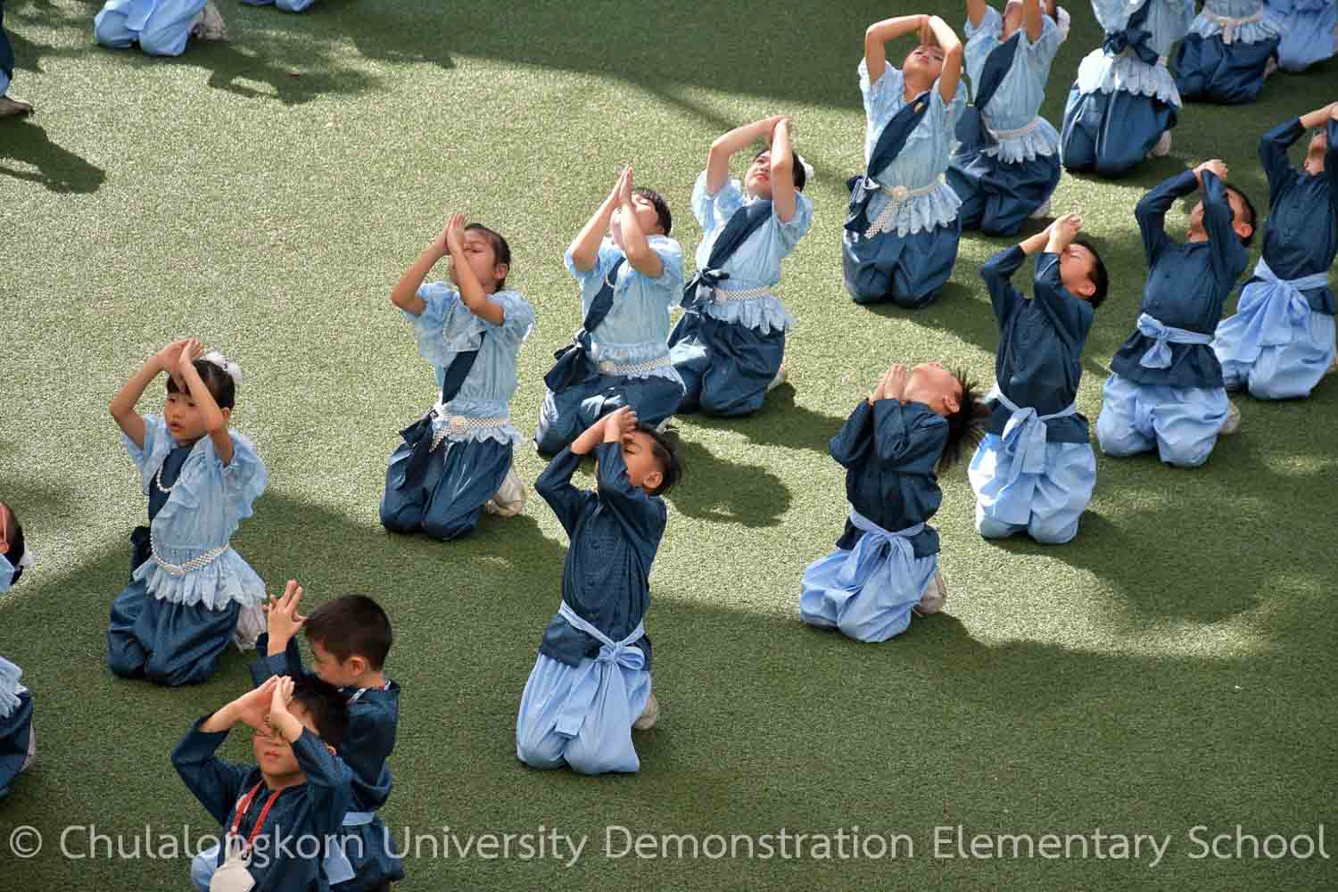 2.ภาพการแสดงรายการที่ 2 ของนักเรียนระดับชั้นประถมศึกษาปีที่ 1 ชื่อชุดการแสดง “สาธิตจุฬาฯ หัวใจไทย” กิจกรรมต้อนรับปีใหม่ 2567 “สาธิตจุฬาฯ สุขี ฤกษ์ดีปีมะโรง”