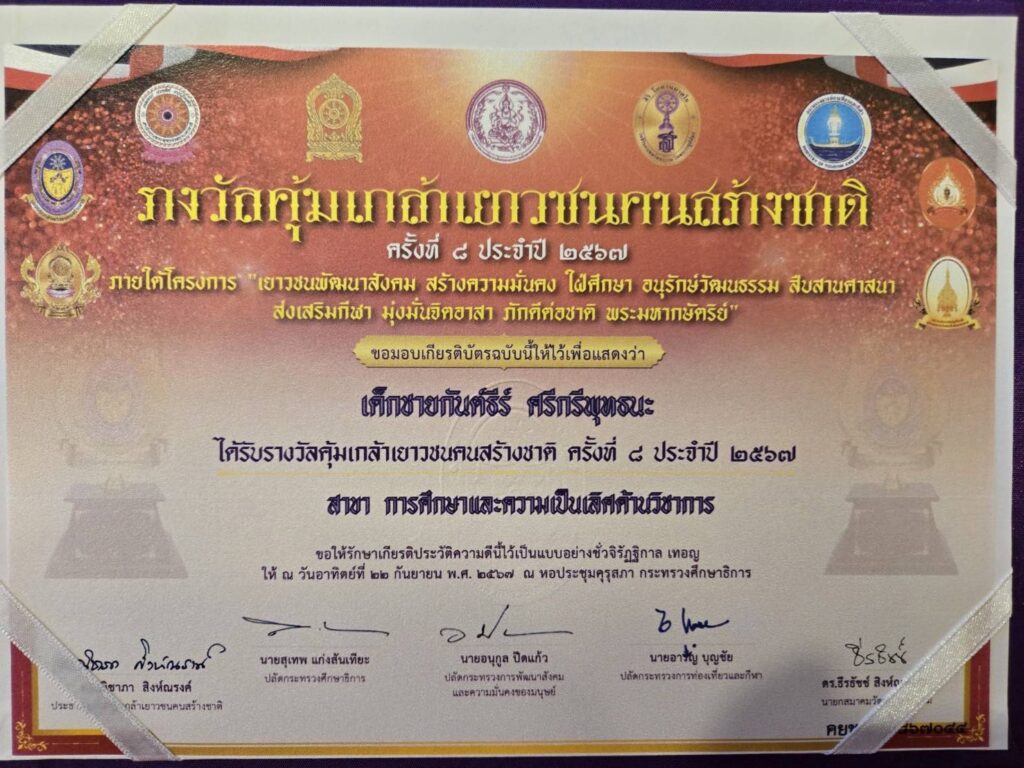 จากมูลนิธิคุ้มเกล้าเยาวชนคนสร้างชาติ ภายใต้โครงการ “เยาวชนพัฒนาสังคม สร้างความมั่นคง ใฝ้ศึกษา อนุรักษ์วัฒนธรรม สืบสานศาสนา ส่งเสริมกีฬา มุ่งมั่นจิตอาสา ภักดีต่อชาติ พระมหากษัตริย์ ” เนื่องในวันเยาวชนแห่งชาติประจำปี ๒๕๖๗