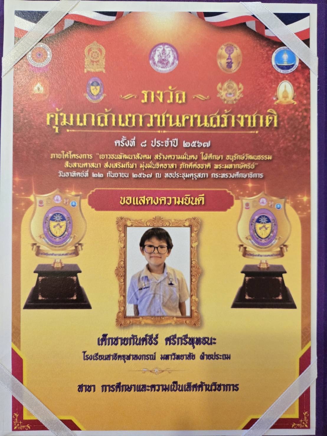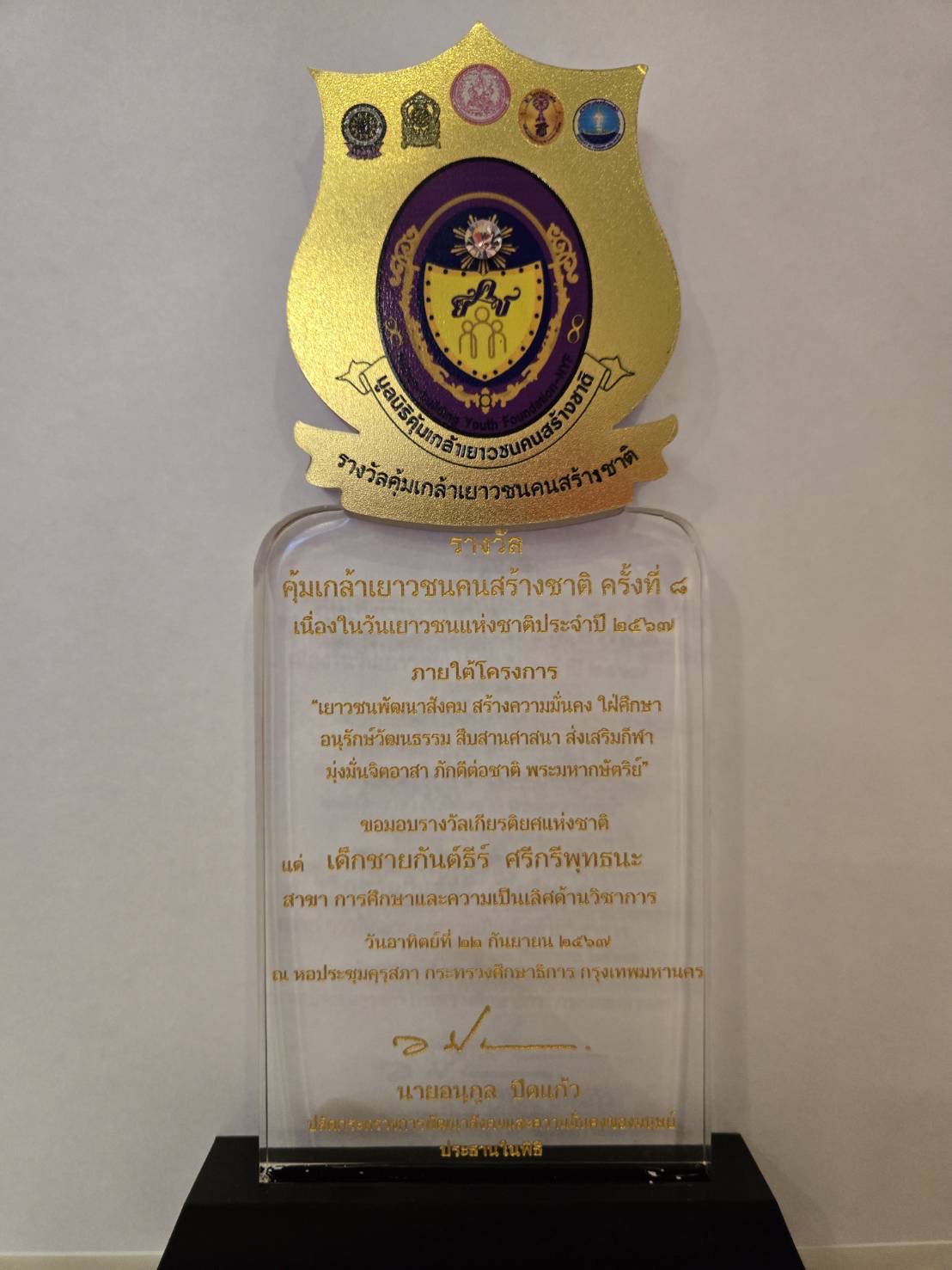 จากมูลนิธิคุ้มเกล้าเยาวชนคนสร้างชาติ ภายใต้โครงการ “เยาวชนพัฒนาสังคม สร้างความมั่นคง ใฝ้ศึกษา อนุรักษ์วัฒนธรรม สืบสานศาสนา ส่งเสริมกีฬา มุ่งมั่นจิตอาสา ภักดีต่อชาติ พระมหากษัตริย์ ” เนื่องในวันเยาวชนแห่งชาติประจำปี ๒๕๖๗