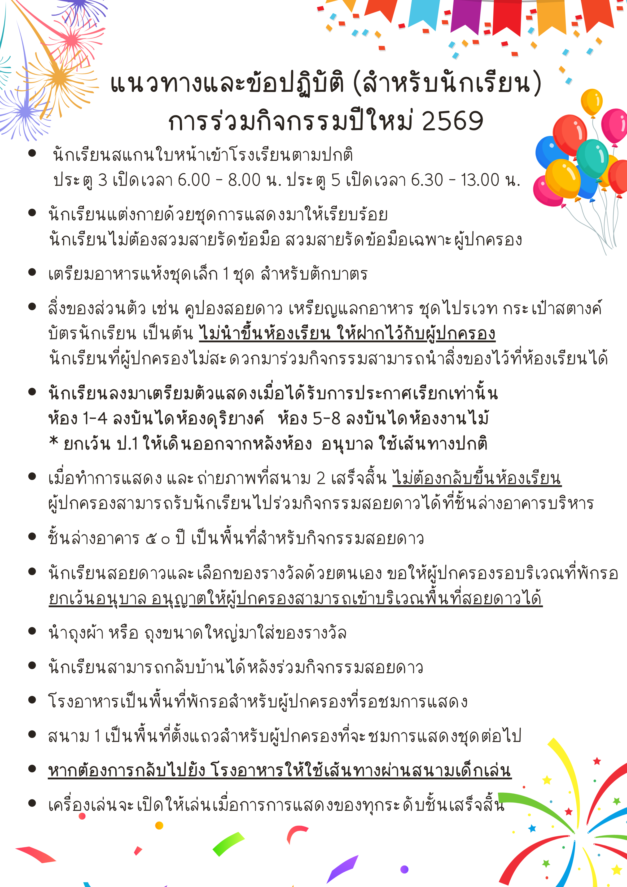 1. นักเรียนแต่งกายชุดการแสดงมาจากบ้าน และสามารถนำชุดไปรเวทมาเปลี่ยนหลังจากแสดงเสร็จ ทั้งนี้ขอความร่วมมือแต่งกายชุดสีสุภาพ