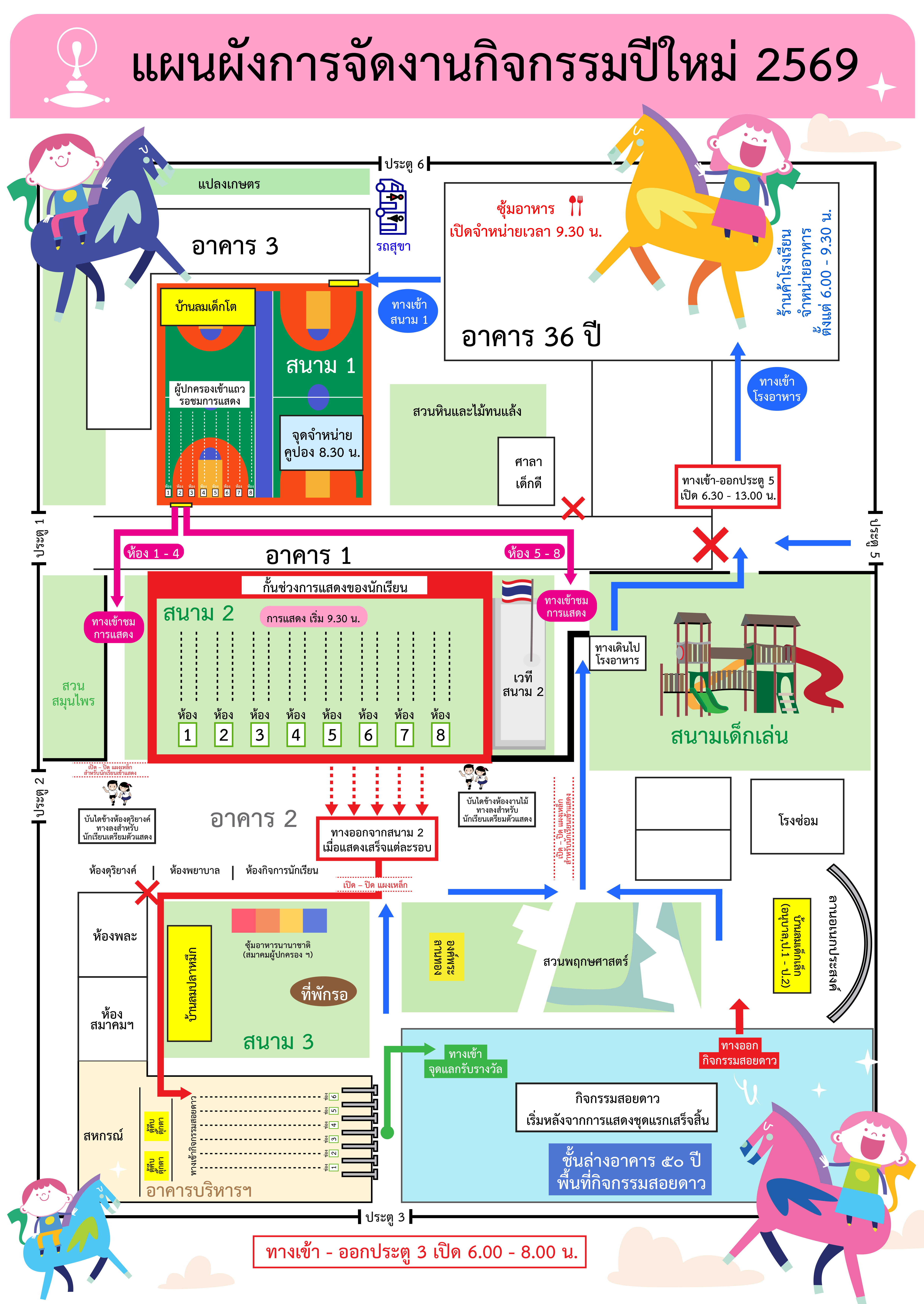 2. วันพฤหัสบดีที่ 4 ธันวาคม 2568 ประตู 5 เปิดช่วงเวลา 06.30 – 13.00 น. สำหรับประตู 3 เปิดช่วงเวลา 06.00 – 08.00 น. และเปิดอีกครั้งหลังเวลา 13.00 น. ขอความร่วมมือมาส่งนักเรียนให้ทันเวลา เพื่อจะได้เข้าร่วมพิธีอย่างพร้อมเพรียงกัน