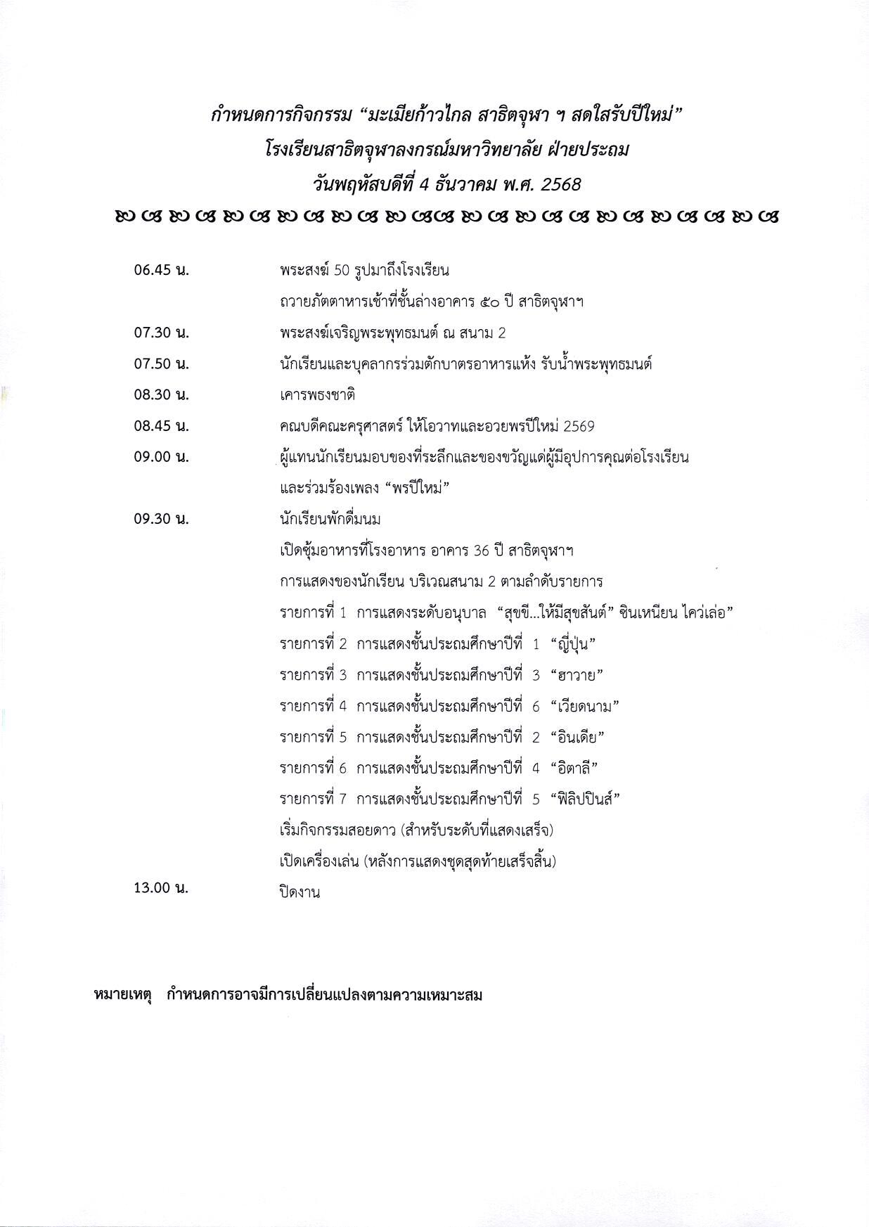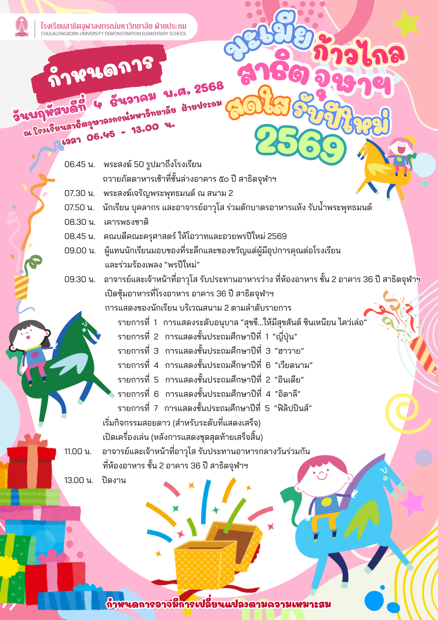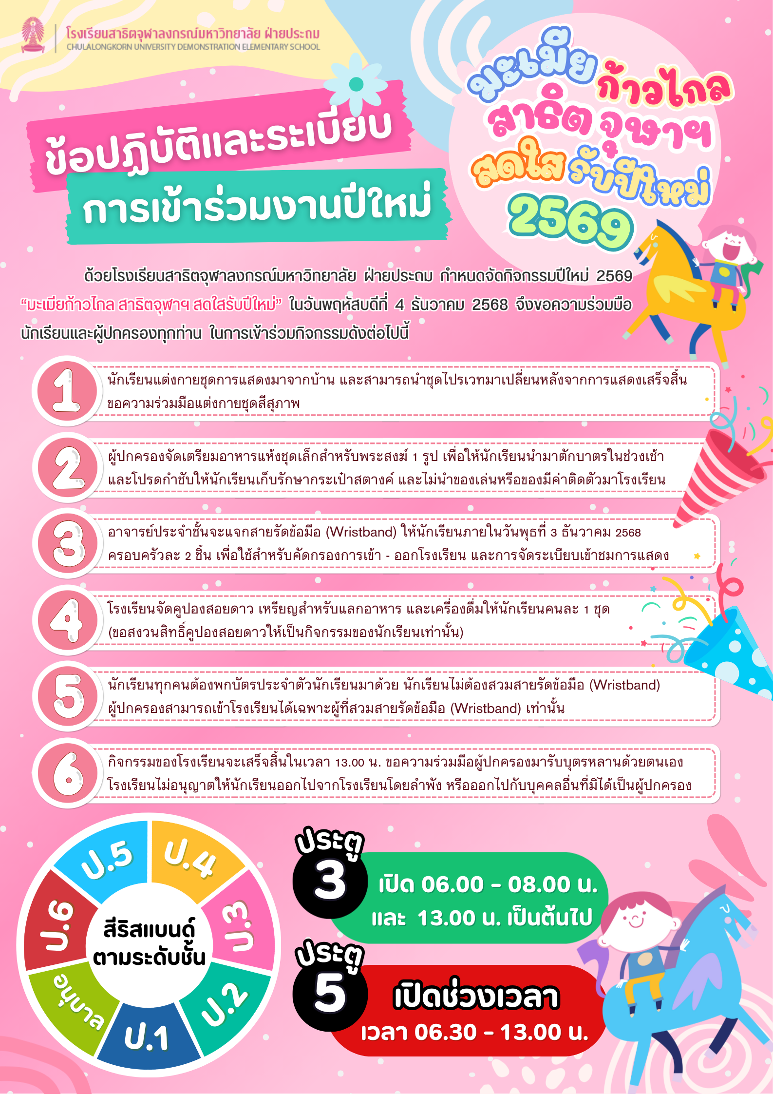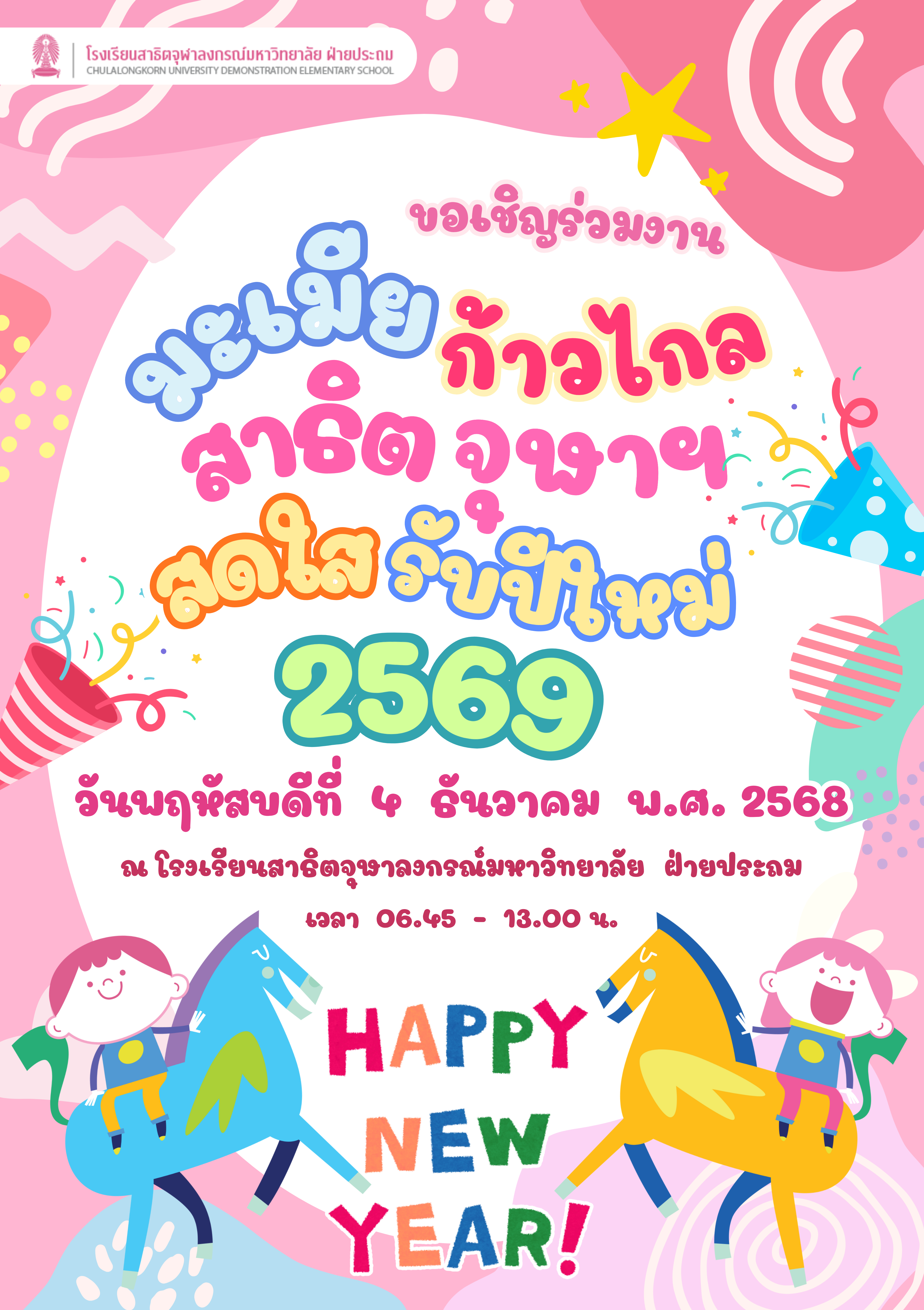 ด้วยโรงเรียนสาธิตจุฬาลงกรณ์มหาวิทยาลัย ฝ่ายประถม และสมาคมผู้ปกครองและครูฯ ได้กำหนดจัดกิจกรรม “มะเมียก้าวไกล สาธิตจุฬา ฯ สดใสรับปีใหม่” ในวันพฤหัสบดีที่ 4 ธันวาคม 2568 เพื่อให้นักเรียน ผู้ปกครอง อาจารย์และบุคลากรทุกฝ่ายของโรงเรียนได้ร่วมทำบุญเพื่อความสิริมงคลแก่ชีวิตและครอบครัว และเป็นโอกาสที่นักเรียนจะได้ร่วมแสดงความกตัญญูต่อผู้มีพระคุณที่ทำประโยชน์ให้แก่โรงเรียน เพื่อให้กิจกรรมบรรลุวัตถุประสงค์ดังกล่าว ทางโรงเรียนขอแจ้งข้อมูลกิจกรรมและขอความร่วมมือจากผู้ปกครองโดยมีรายละเอียดดังนี้