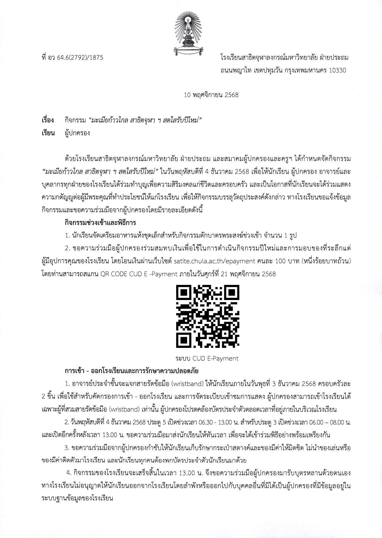 2. ขอความร่วมมือผู้ปกครองร่วมสมทบเงินเพื่อใช้ในการดำเนินกิจกรรมปีใหม่และการมอบของที่ระลึกแด่ผู้มีอุปการคุณของโรงเรียน โดยโอนเงินผ่านเว็บไซต์ satite.chula.ac.th/epayment คนละ 100 บาท (หนึ่งร้อยบาทถ้วน) โดยท่านสามารถสแกน QR CODE CUD E -Payment ภายในวันศุกร์ที่ 21 พฤศจิกายน 2568