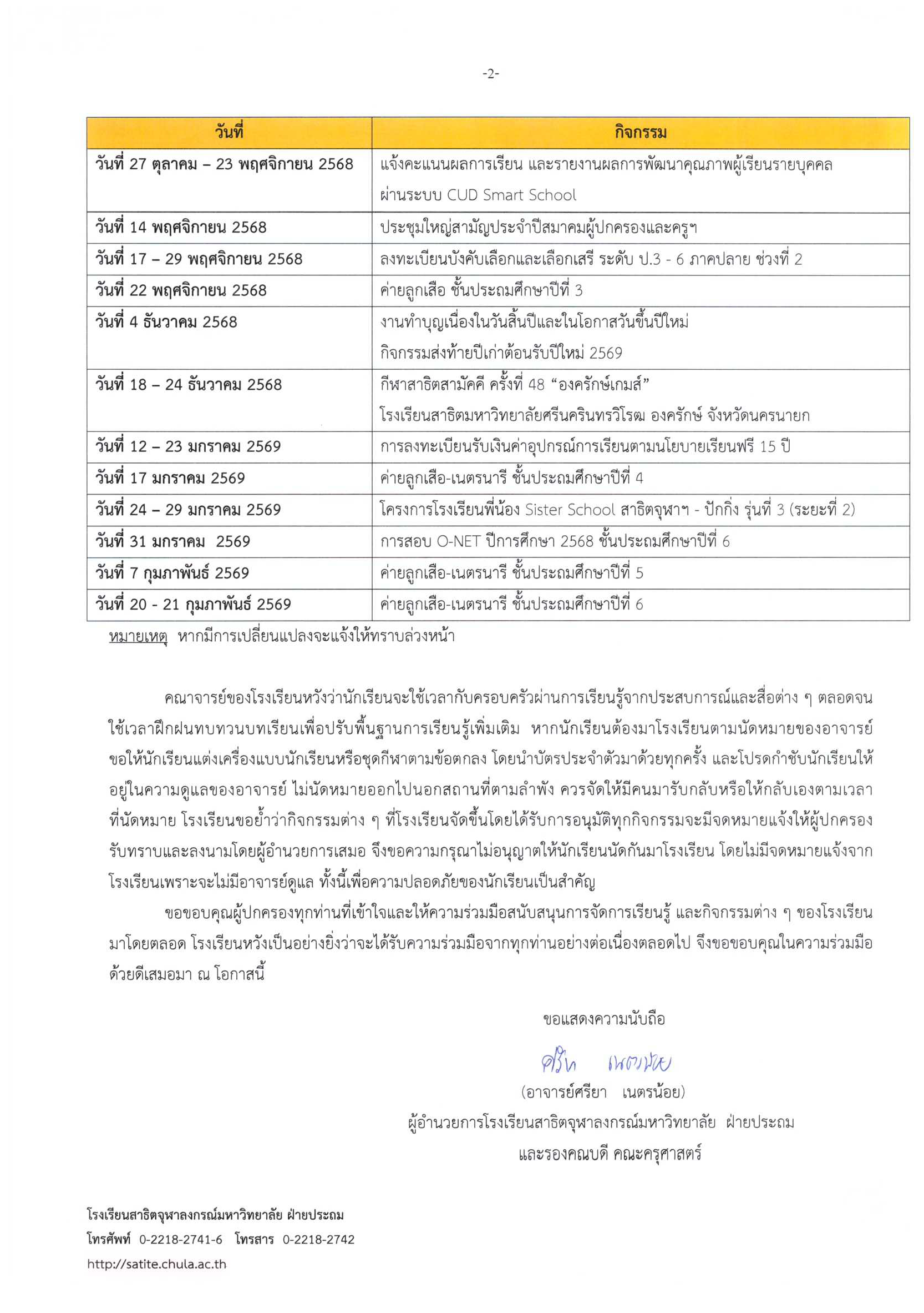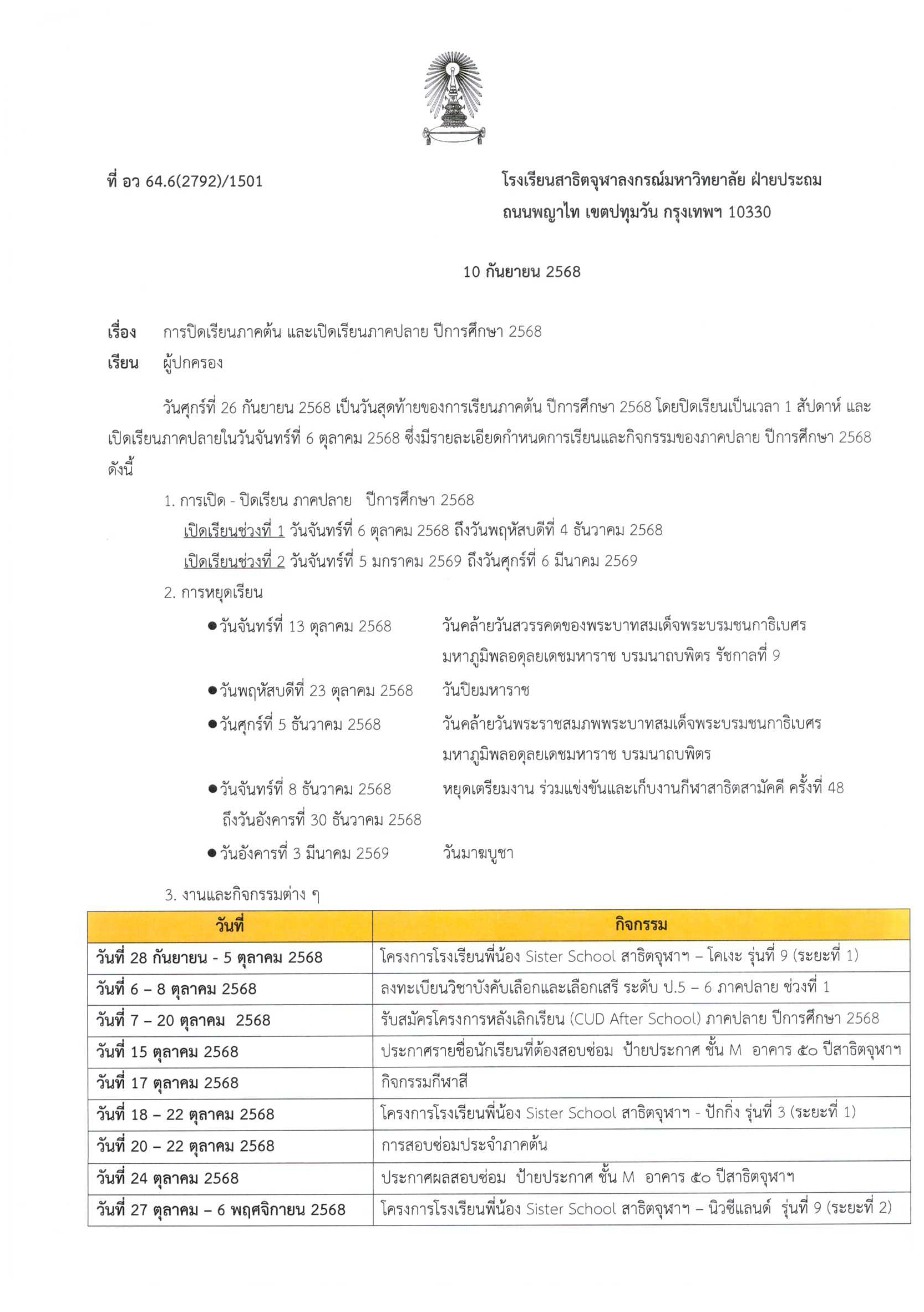 ด้วยวันศุกร์ที่ 26 กันยายน 2568 เป็นวันสุดท้ายของการเรียนภาคต้น ปีการศึกษา 2568 โดยปิดเรียนเป็นเวลา 1 สัปดาห์ และเปิดเรียนภาคปลายในวันจันทร์ที่ 6 ตุลาคม 2568 ซึ่งมีรายละเอียดกำหนดการเรียนและกิจกรรมของภาคปลาย ปีการศึกษา 2568 ดังนี้