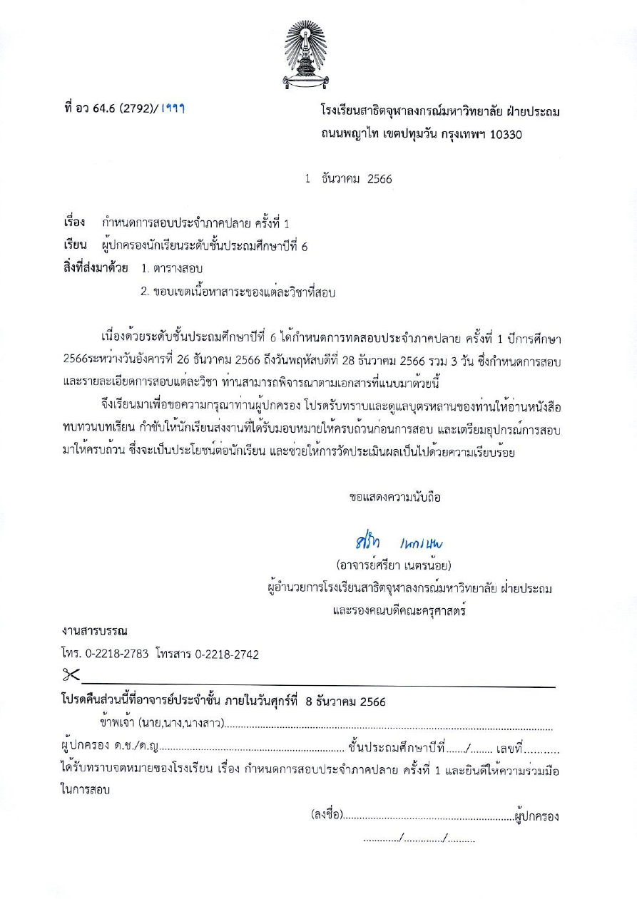 จดหมายโรงเรียน เรื่อง กำหนดการสอบประจำภาคปลาย ครั้งที่ 1 ของนักเรียนระดับชั้นประถมศึกษาปีที่ 6 By Web Master|2023-11-27T10:04:18+07:00December 1, 2023|จดหมายแจ้งจากโรงเรียน| View Larger Image