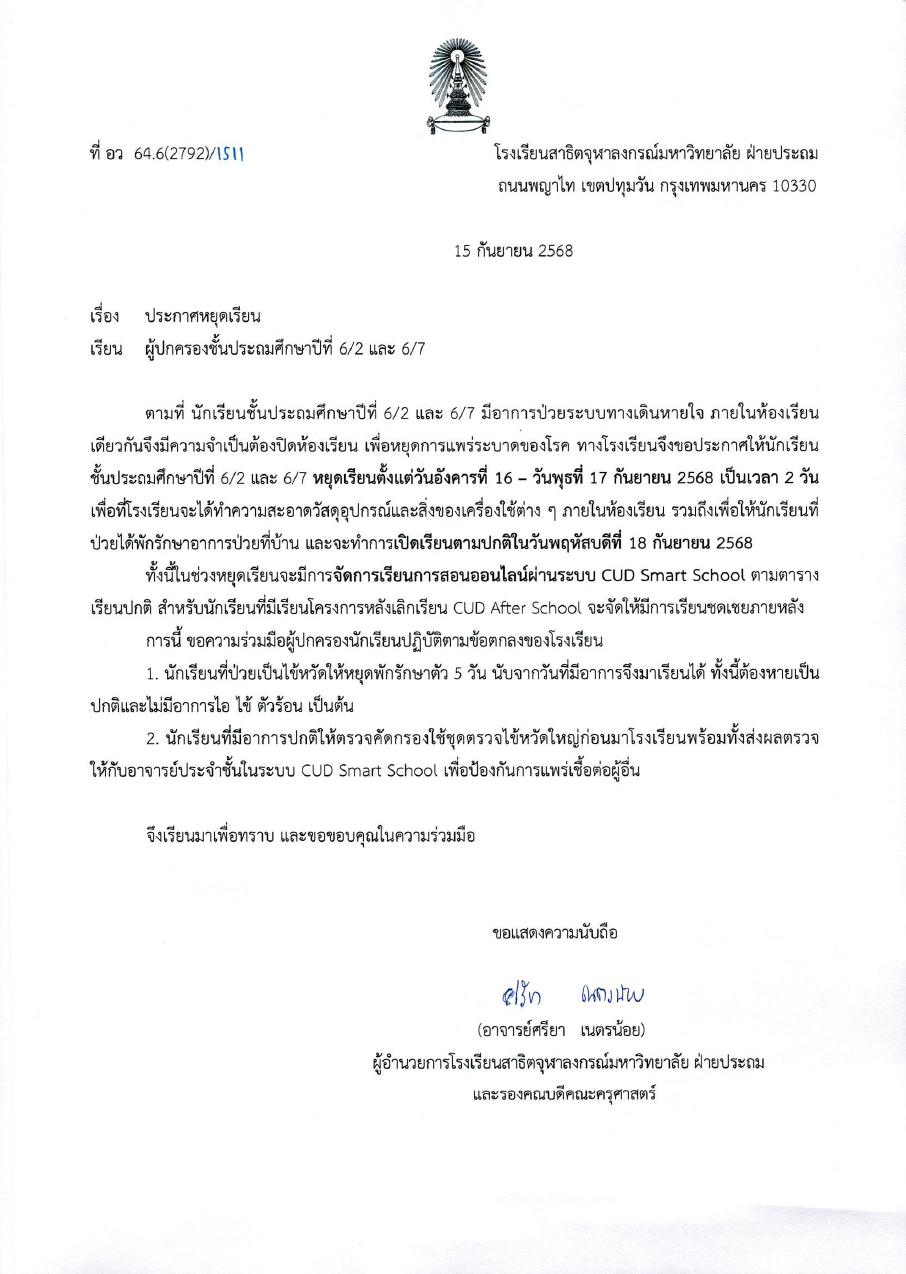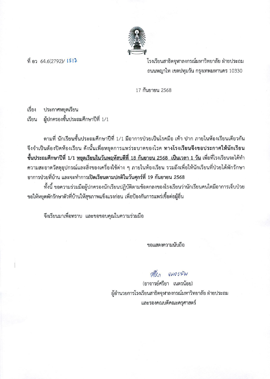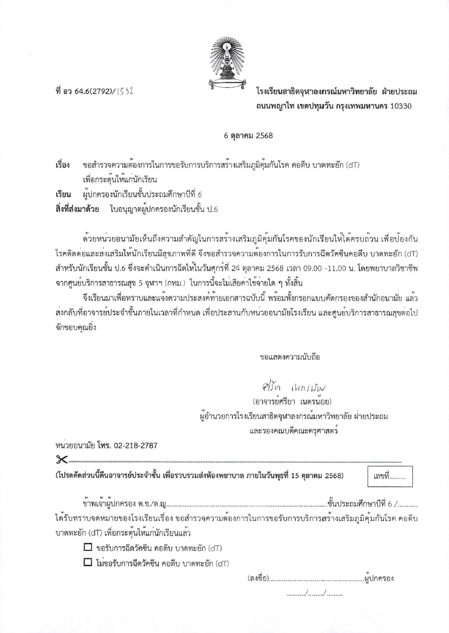 จดหมายโรงเรียน เรื่อง ขอสำรวจความต้องการในการขอรับบริการสร้างภูมิคุ้มกันโรคคอตีบ บาดทะยัก เพื่อกระตุ้นแก่นักเรียน