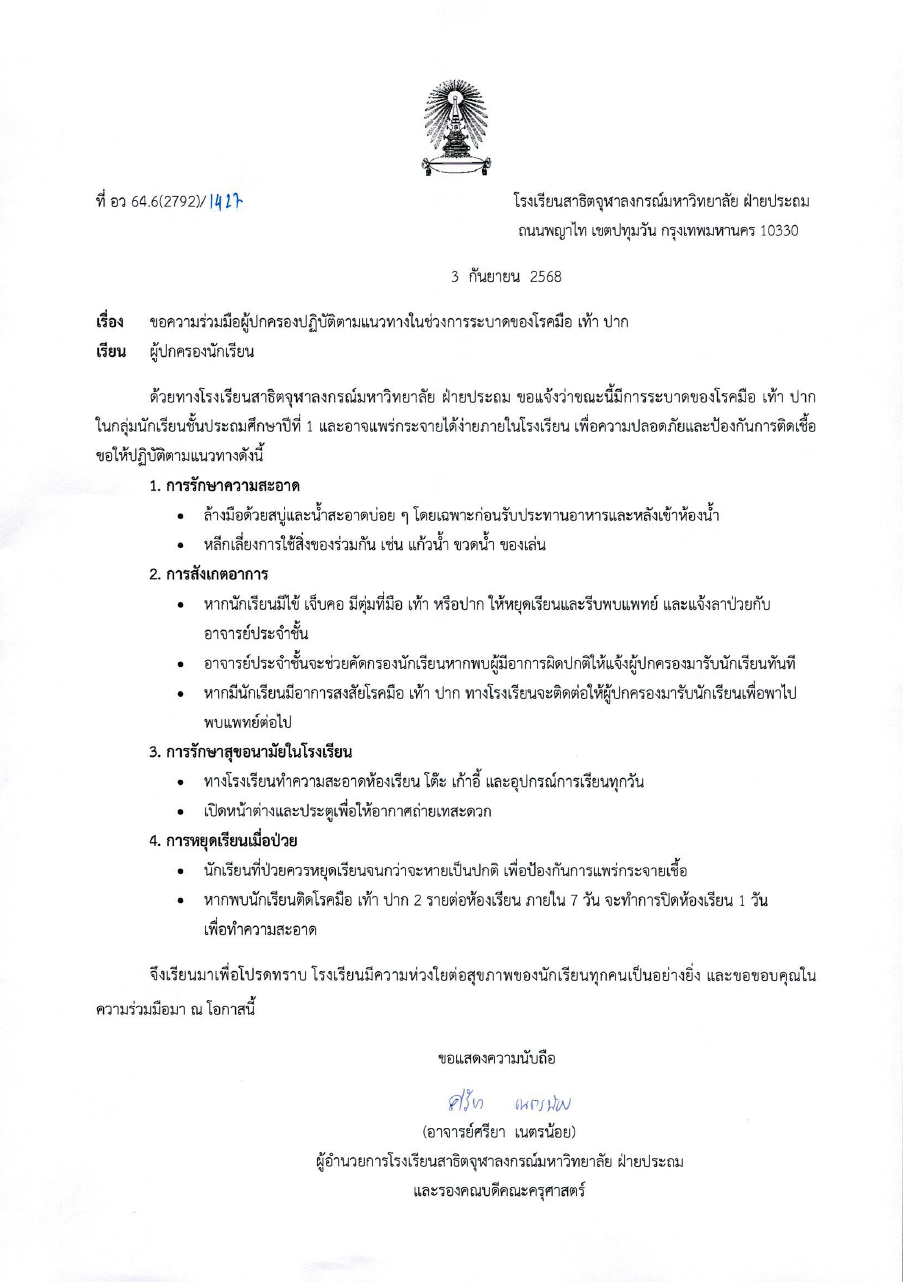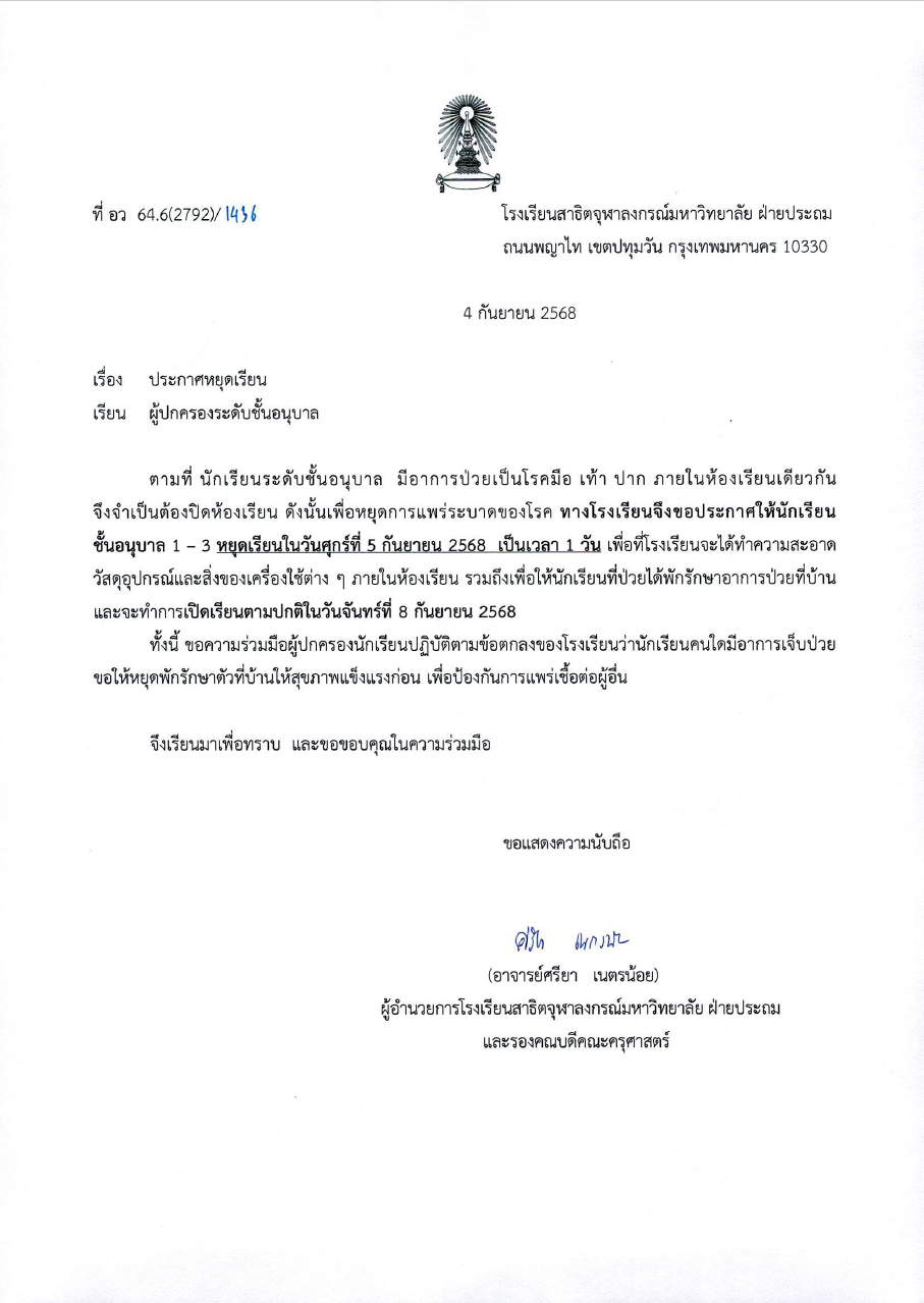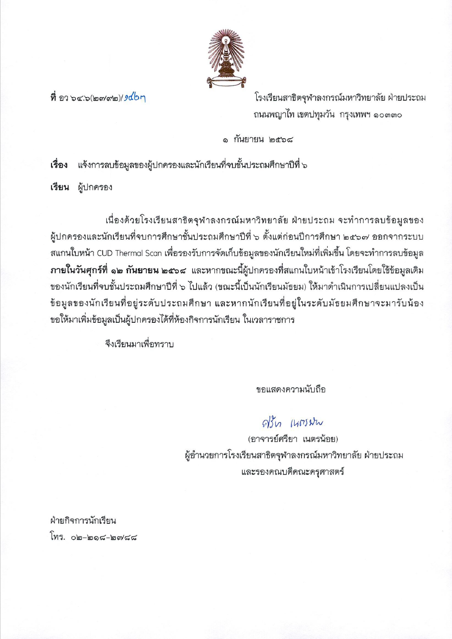 จดหมายโรงเรียน เรื่อง การแจ้งลบข้อมูลผู้ปกครองและนักเรียนระดับชั้นประถมศึกษาปีที่ 6 ตั้งแต่ก่อนปีการศึกษา 2567