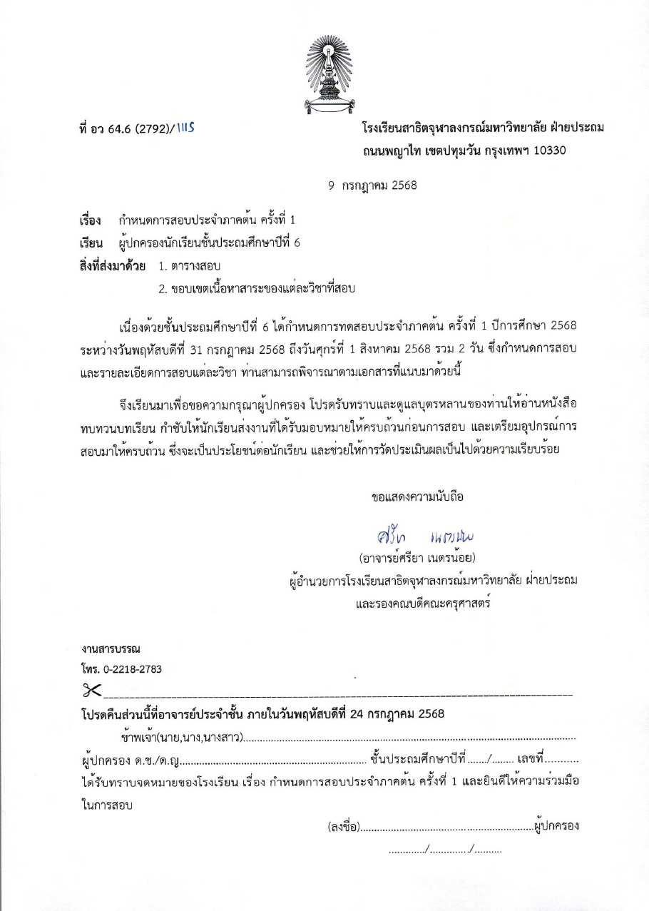 จดหมายโรงเรียน เรื่อง กำหนดการสอบประจำภาคต้น ครั้งที่ 1 สำหรับนักเรียนระดับชั้นประถมศึกษาปีที่ 6