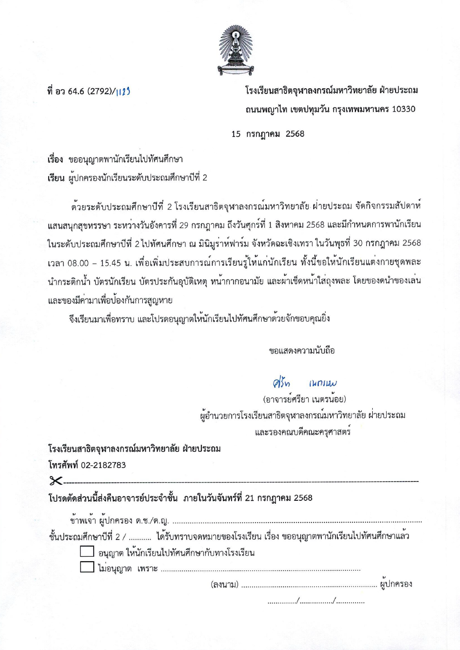 จดหมายโรงเรียน เรื่อง ขออนุญาตพานักเรียนระดับชั้นประถมศึกษาปีที่ 2 ไปทัศนศึกษา