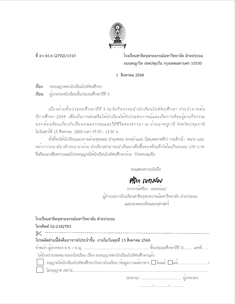 จดหมายโรงเรียน เรื่อง ขอพานักเรียนระดับชั้นประถมศึกษาปีที่ 3 ไปทัศนศึกษา