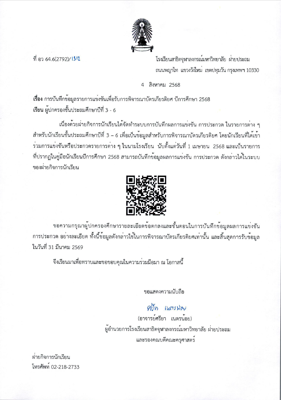 จดหมายโรงเรียน เรื่อง การบันทึกข้อมูลรายการแข่งขันเพื่อรับการพิจารณาบัตรเกียรติยศ ปีการศึกษา 2568