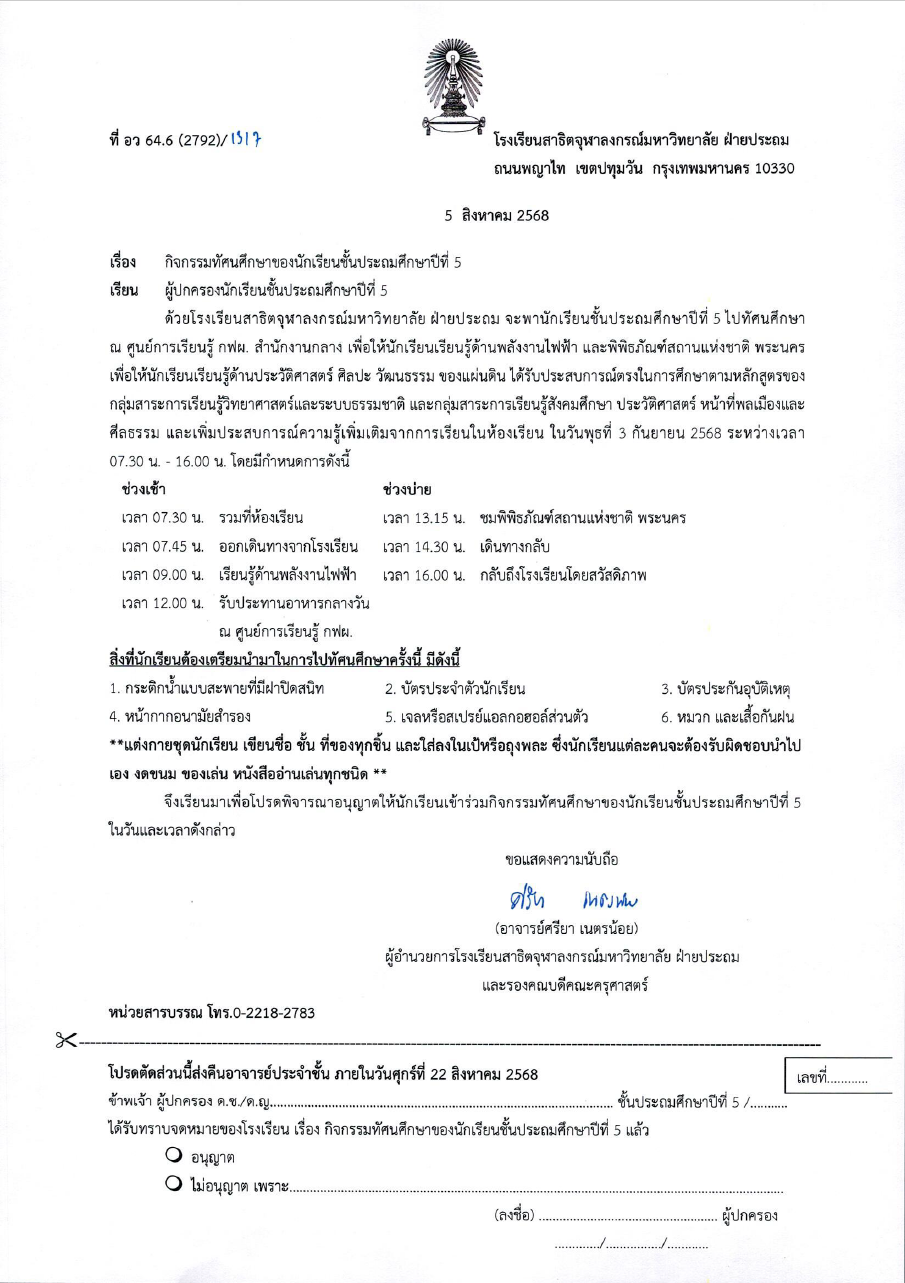 จดหมายโรงเรียน เรื่อง การทัศนศึกษาของนักเรียนระดับชั้นประถมศึกษาปีที่ 5