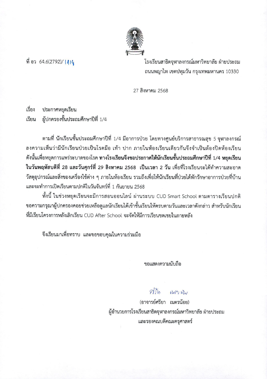 จดหมายโรงเรียน เรื่อง ประกาศหยุดเรียนสำหรับนักเรียนชั้นประถมศึกษาปีที่ 1/4