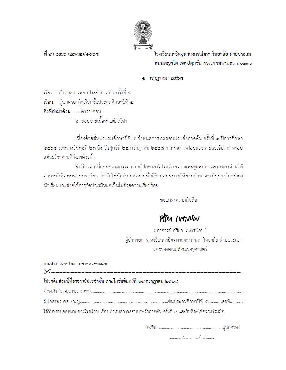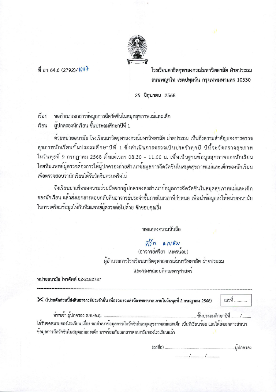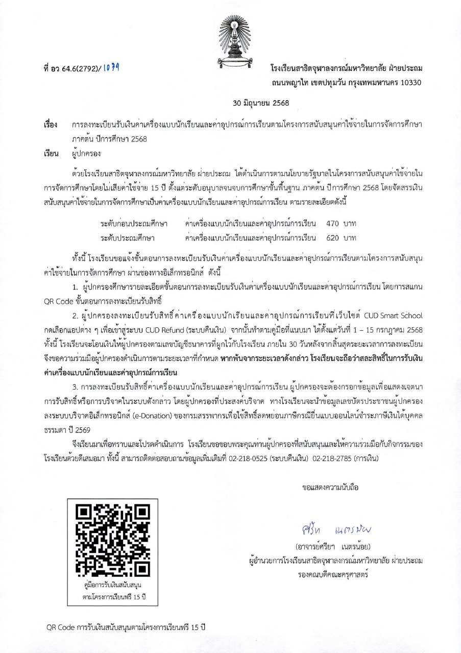 จดหมายโรงเรียน เรื่อง การลงทะเบียนรับเงินค่าเครื่องแบบนักเรียนและค่าอุปกรณ์การเรียนฯ ภาคต้น ปีการศึกษา 2568