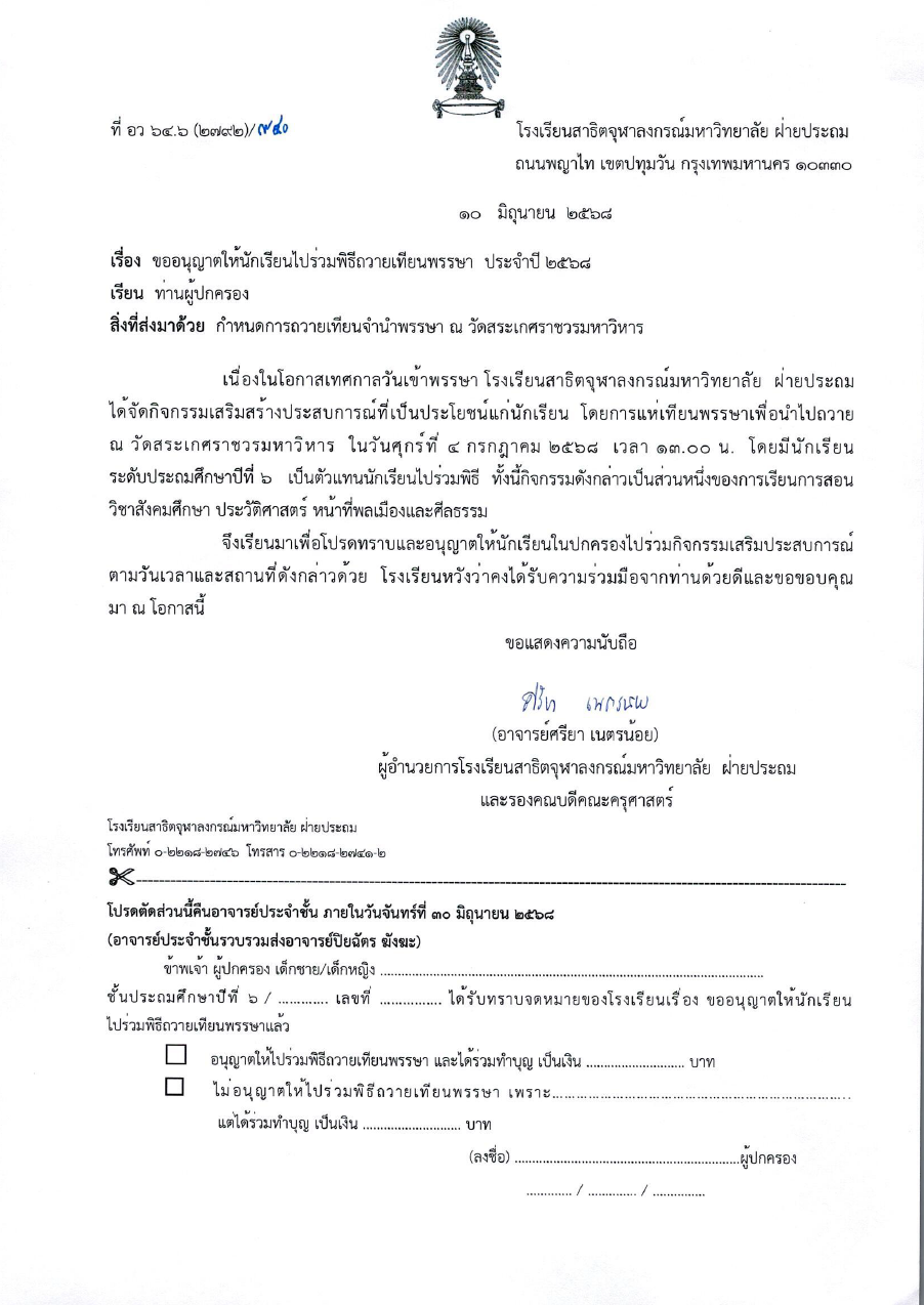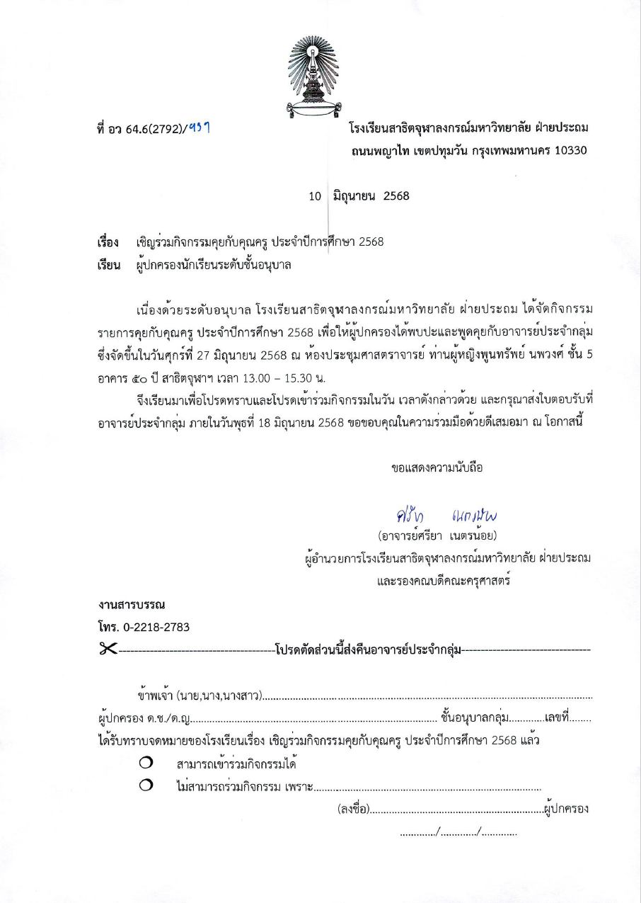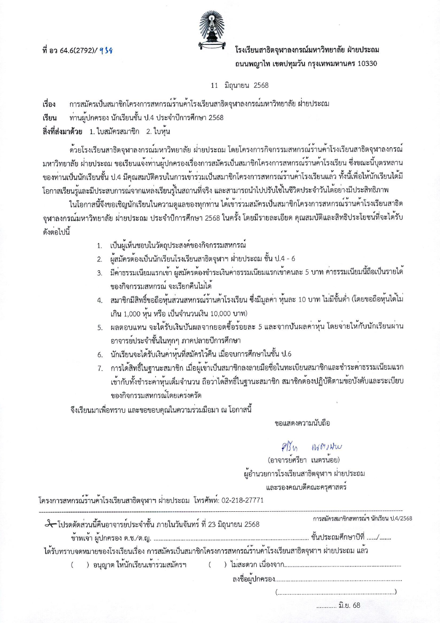 จดหมายโรงเรียน เรื่อง การสมัครเป็นสมาชิกโครงการสหกรณ์ร้านค้าโรงเรียนสาธิตจุฬาลงกรณ์มหาวิทยาลัย ฝ่ายประถม