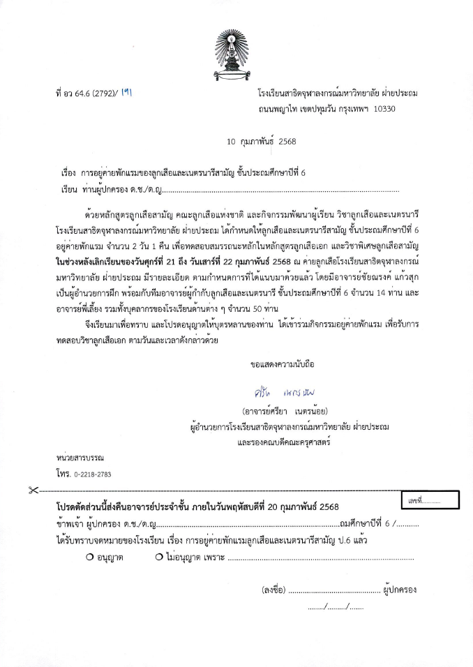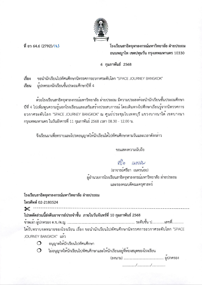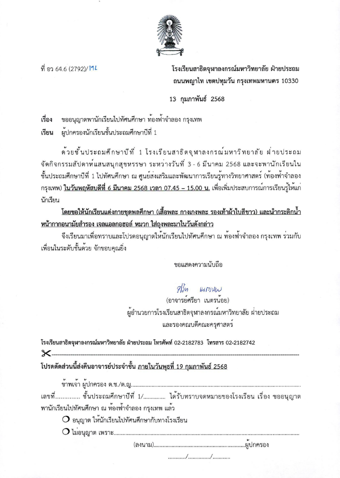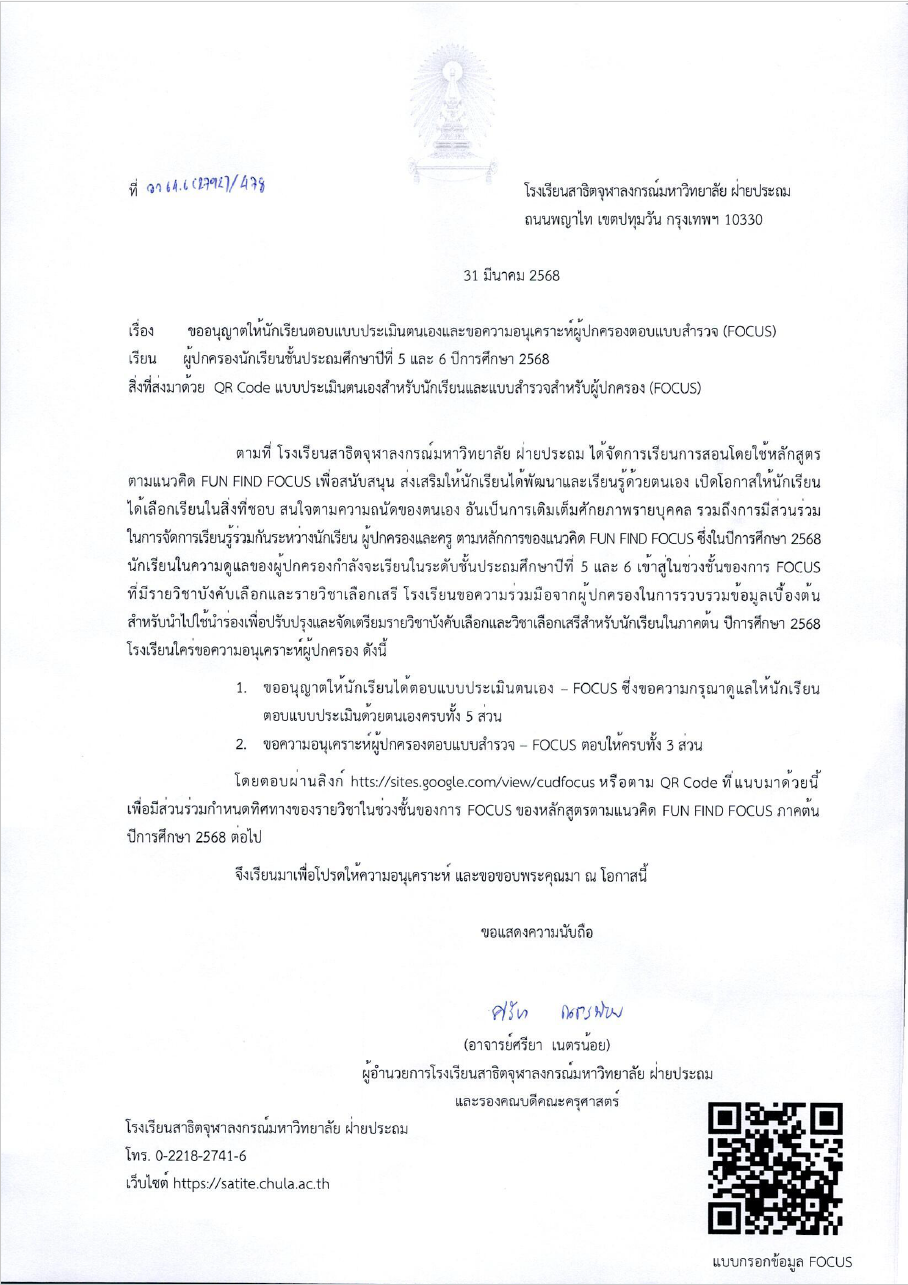 จดหมายโรงเรียน เรื่อง ขออนุญาตให้นักเรียนตอบแบบประเมินตนเอง และขอความอนุเคราะห์ผู้ปกครองตอบแบบสำรวจ (FOCUS)