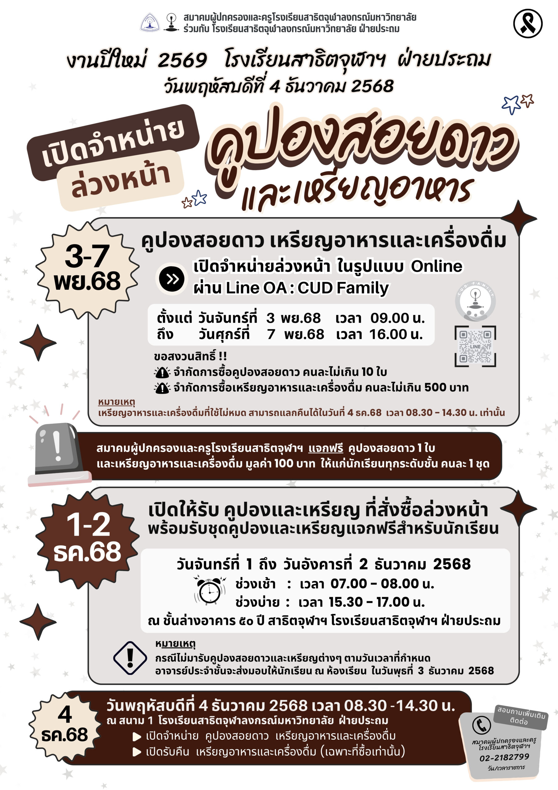 ด้วยสมาคมผู้ปกครองและครูโรงเรียนสาธิตจุฬาลงกรณ์มหาวิทยาลัย ร่วมกับโรงเรียนสาธิตจุฬาลงกรณ์มหาวิทยาลัย ฝ่ายประถม จะจัดกิจกรรมปีใหม่ ปี 2569 ขึ้นในวันพฤหัสบดีที่ 4 ธันวาคม 2568 โดยมีวัตถุประสงค์ดังนี้