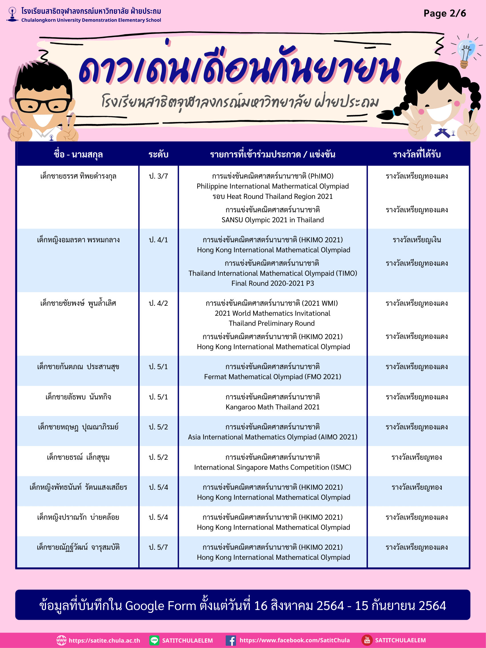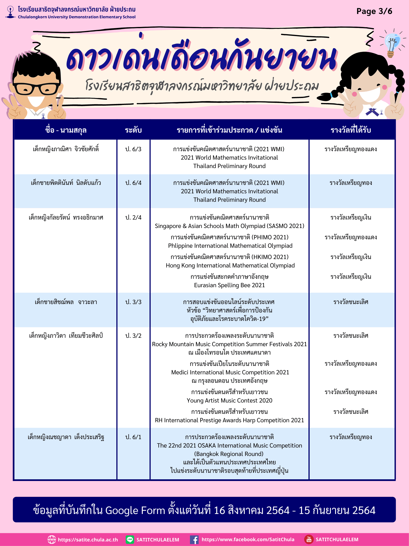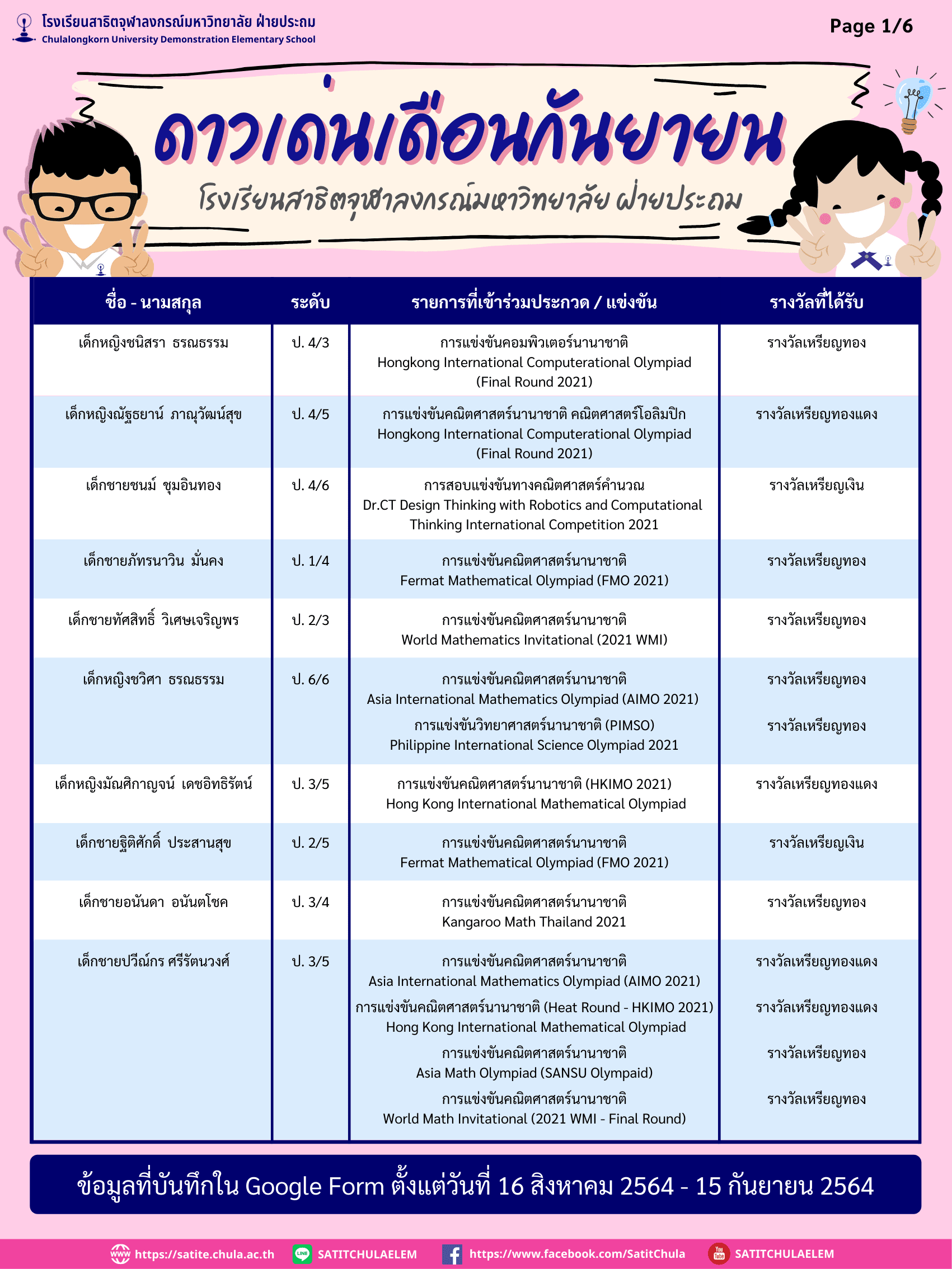 ดาวเด่นเดือนกันยายน ประจำปีการศึกษา 2564 (ข้อมูลบันทึกใน Google Form ตั้งแต่วันที่ 16 สิงหาคม – 15 กันยายน 2564) By Web Master|2021-10-10T12:53:39+07:00October 6, 2021|ความภูมิใจสาธิตจุฬาฯ| View Larger Image ดาวน์โหลดเอกสาร PDF File คลิกที่นี่