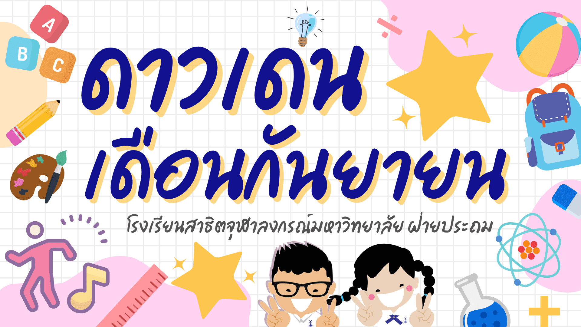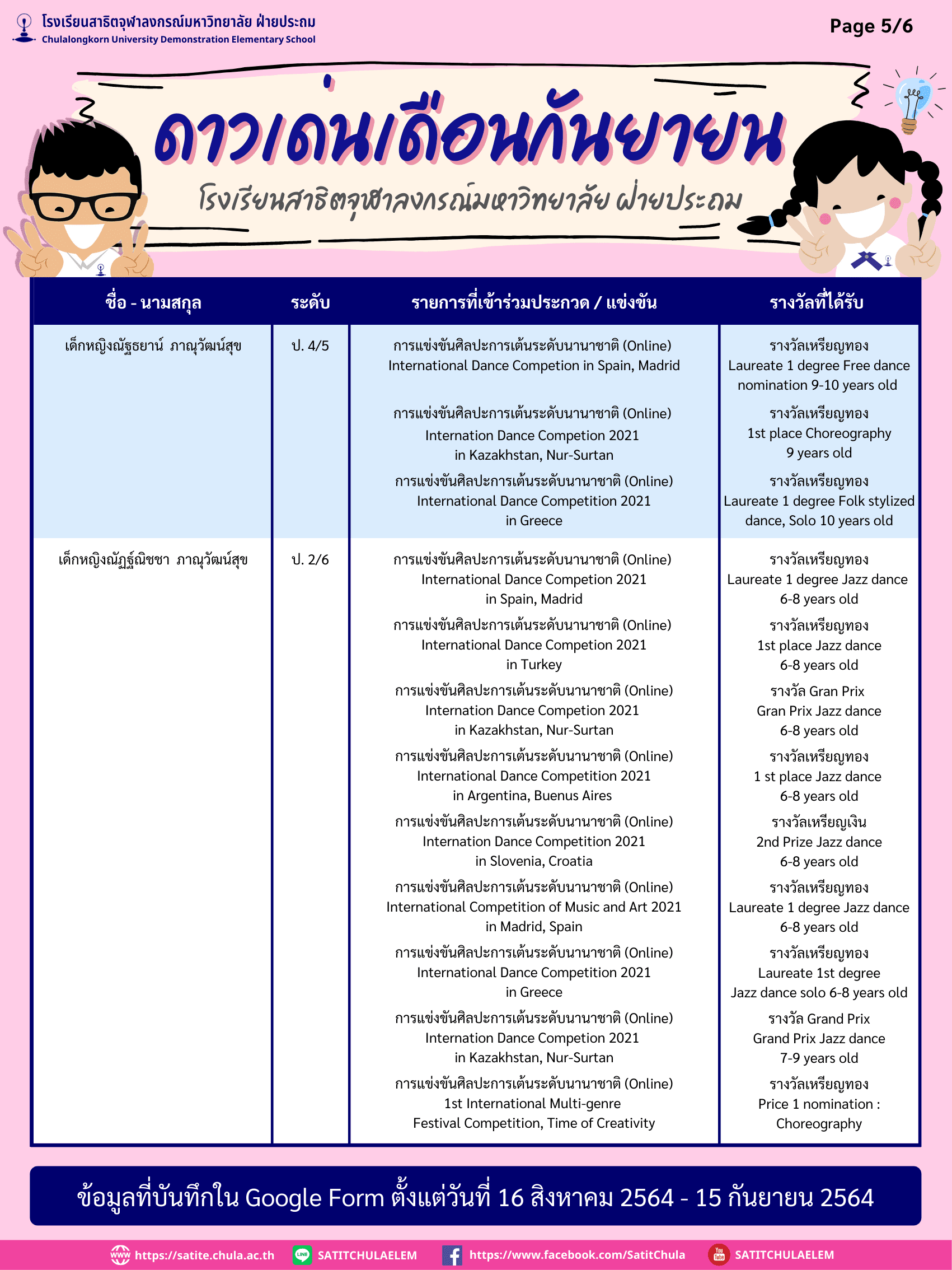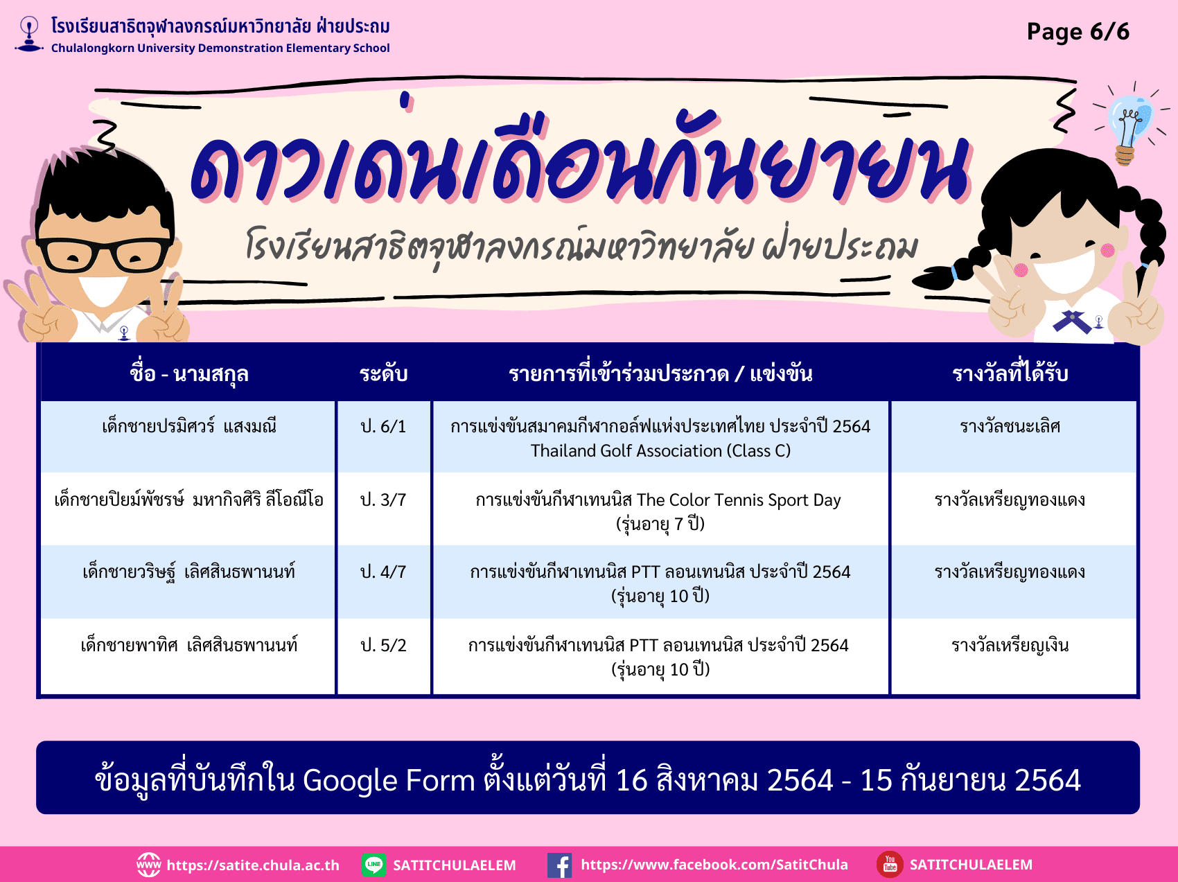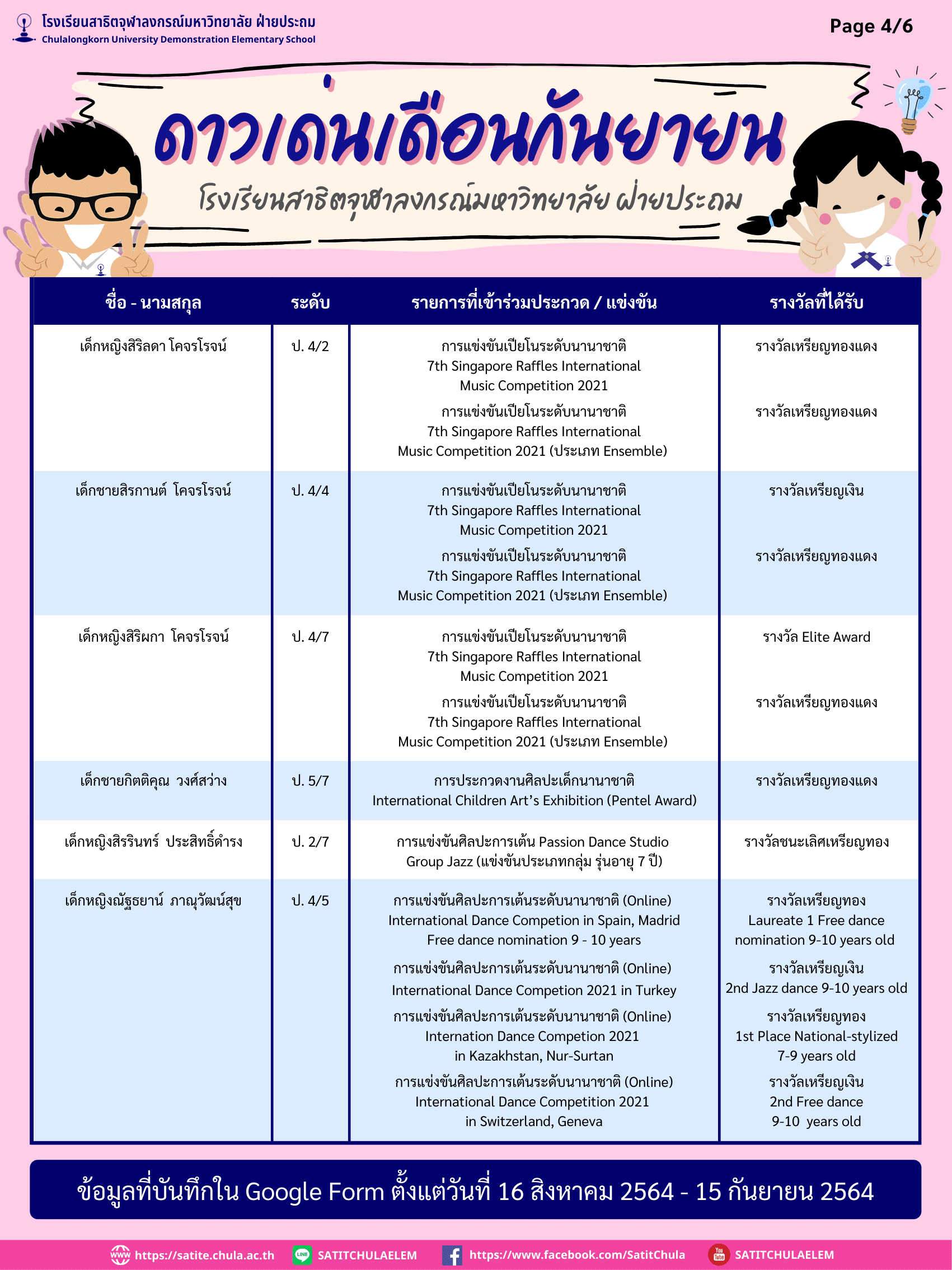 ดาวเด่นเดือนกันยายน ประจำปีการศึกษา 2564 (ข้อมูลบันทึกใน Google Form ตั้งแต่วันที่ 16 สิงหาคม – 15 กันยายน 2564) By Web Master|2021-10-10T12:53:39+07:00October 6, 2021|ความภูมิใจสาธิตจุฬาฯ| View Larger Image ดาวน์โหลดเอกสาร PDF File คลิกที่นี่