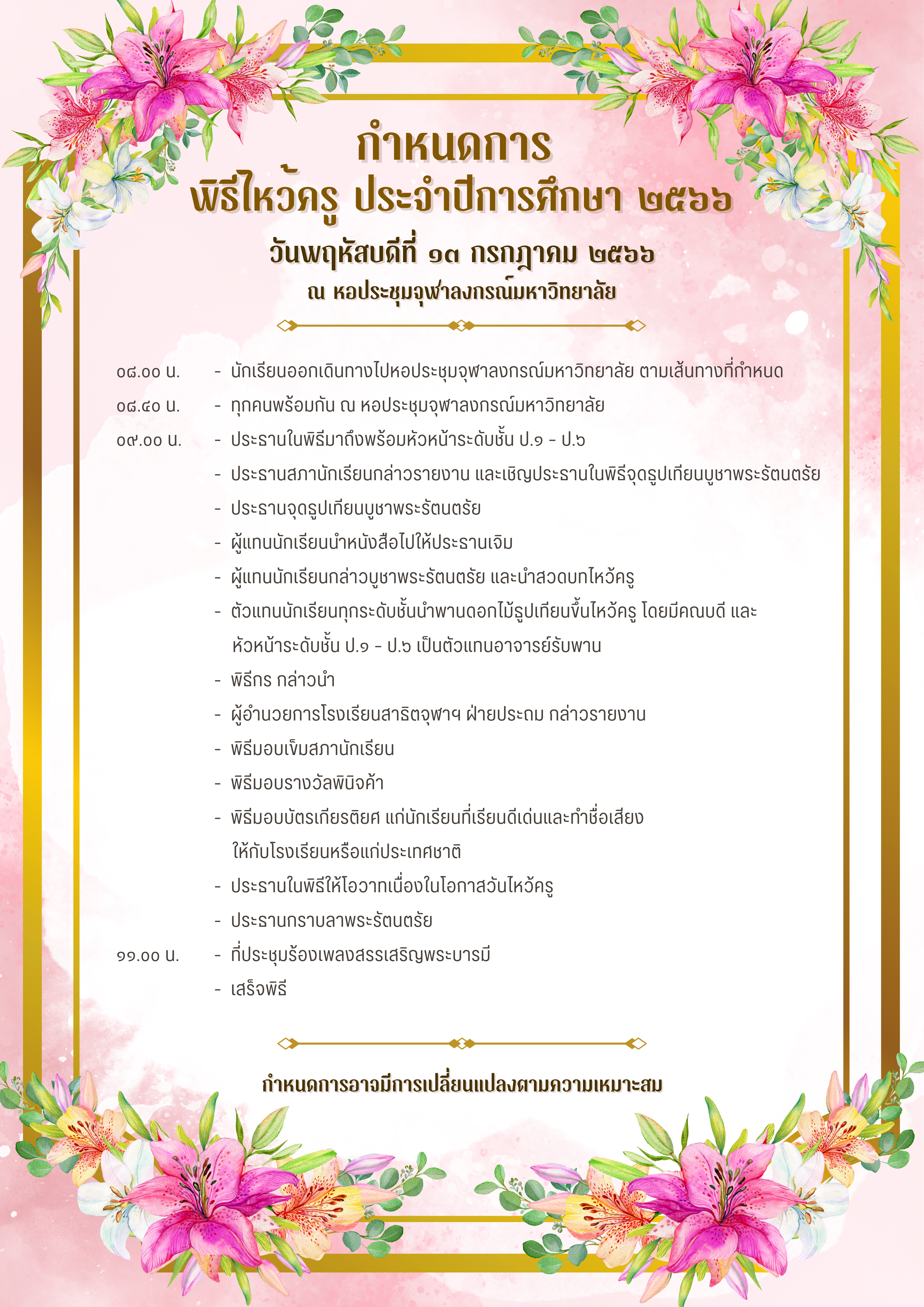 เข้าสู่เว็บไซต์โรงเรียน https://satite.chula.ac.th/กำหนดการพิธีไหว้ครู-2566/