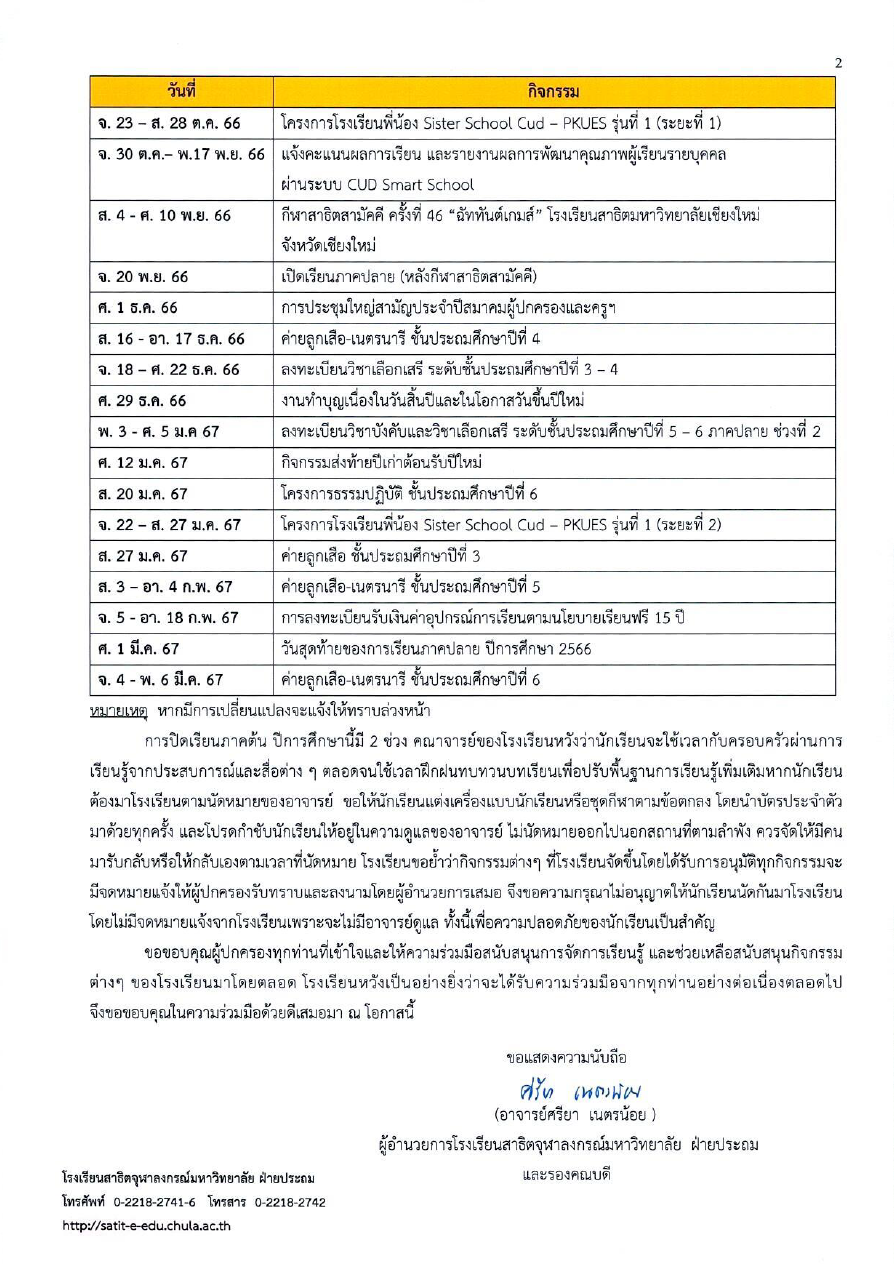 เปิดเรียนช่วงที่ 2 วันจันทร์ที่ 20 พฤศจิกายน 2566 ถึงวันศุกร์ที่ 1 มีนาคม 2567