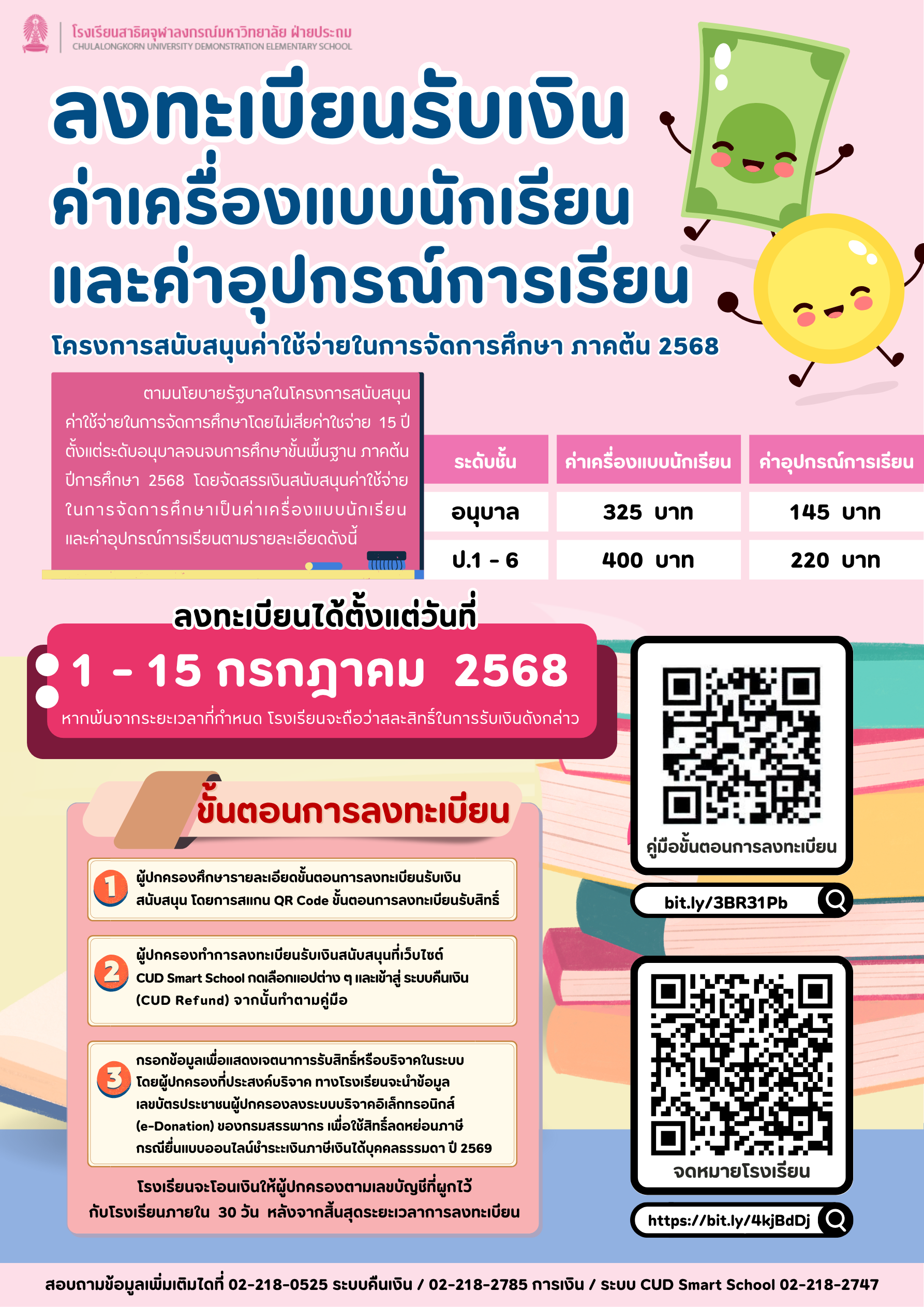 การลงทะเบียนรับเงินค่าเครื่องแบบนักเรียนและค่าอุปกรณ์การเรียนตามโครงการสนับสนุนค่าใช้จ่ายในการจัดการศึกษา ภาคต้น ปีการศึกษา 2568