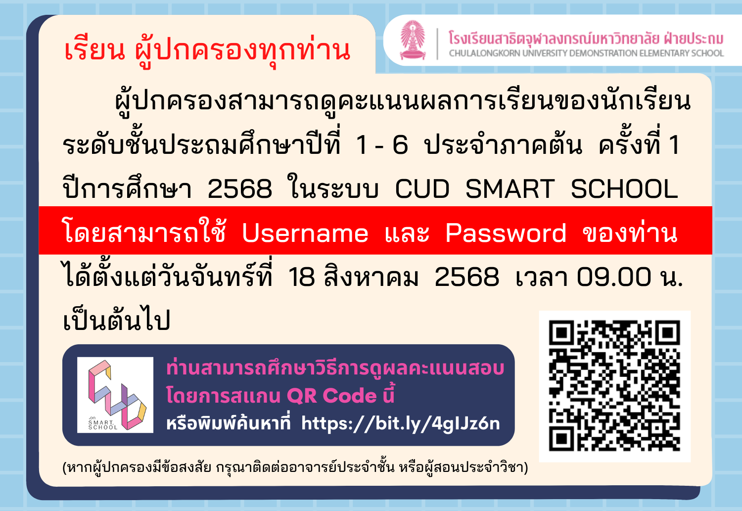 การดูคะแนนผลการเรียนของนักเรียนระดับชั้นประถมศึกษาปีที่ 1 – 6 ประจำภาคต้น ครั้งที่ 1 ปีการศึกษา 2568 ในระบบ CUD SMART SCHOOL