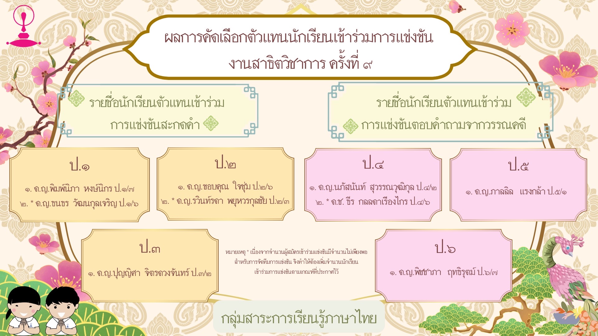 ผลการคัดเลือกตัวแทนนักเรียนระดับชั้น ป.๖ เพื่อเข้าร่วมการแข่งขันตอบคำถามจากวรรณคดี