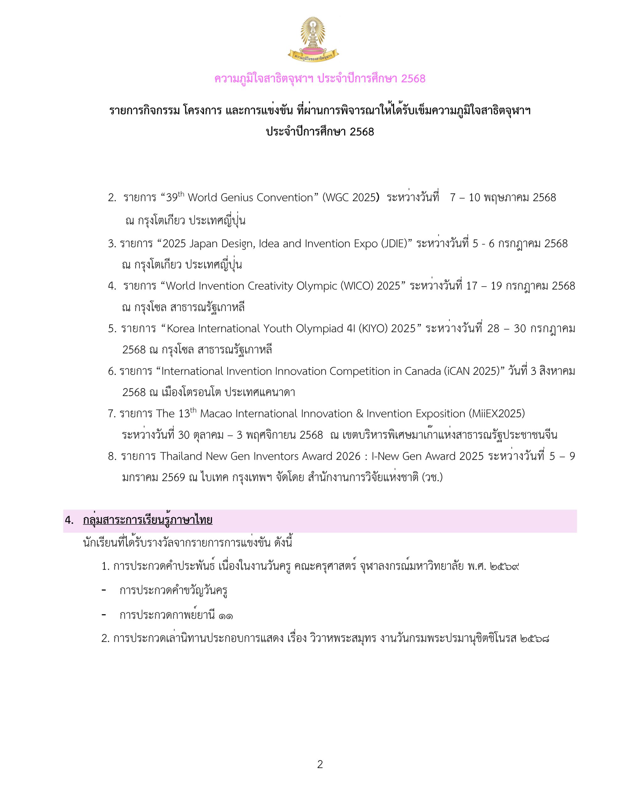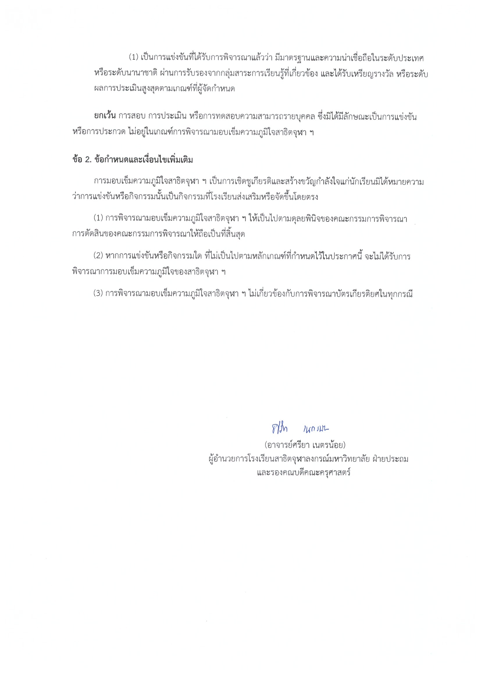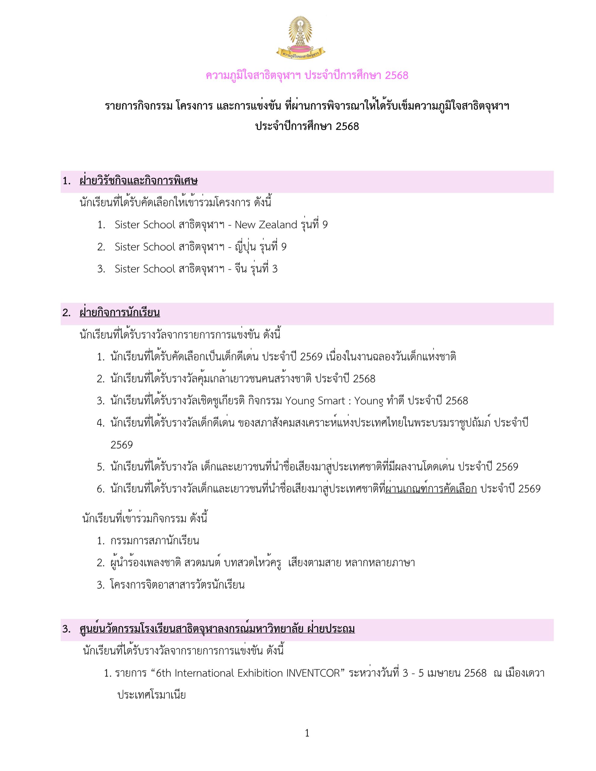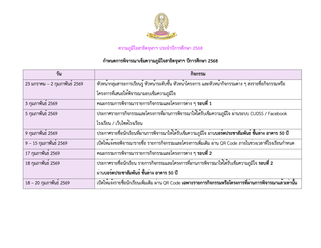 เพื่อให้เป็นวาระพิเศษในการแสดงความชื่นชมต่อนักเรียนที่เสียสละและมุ่งมั่นทำกิจกรรมเพื่อส่วนรวม สร้างชื่อเสียงให้แก่ตนเองและโรงเรียน ทางโรงเรียนจะมีการประกาศรายชื่อ รอบที่ 1 ในวันจันทร์ที่ 9 กุมภาพันธ์ 2569 บริเวณป้ายประชาสัมพันธ์ ชั้นล่างอาคาร 50 ปี สาธิตจุฬาฯ