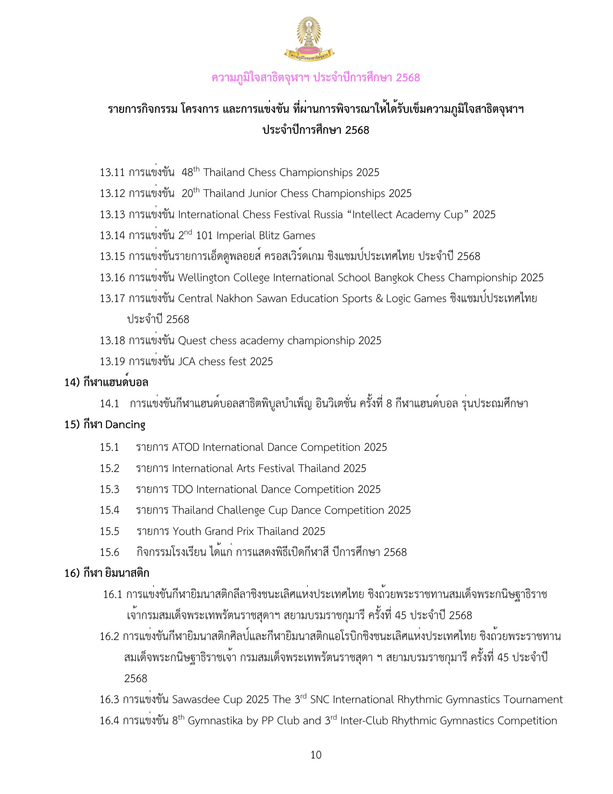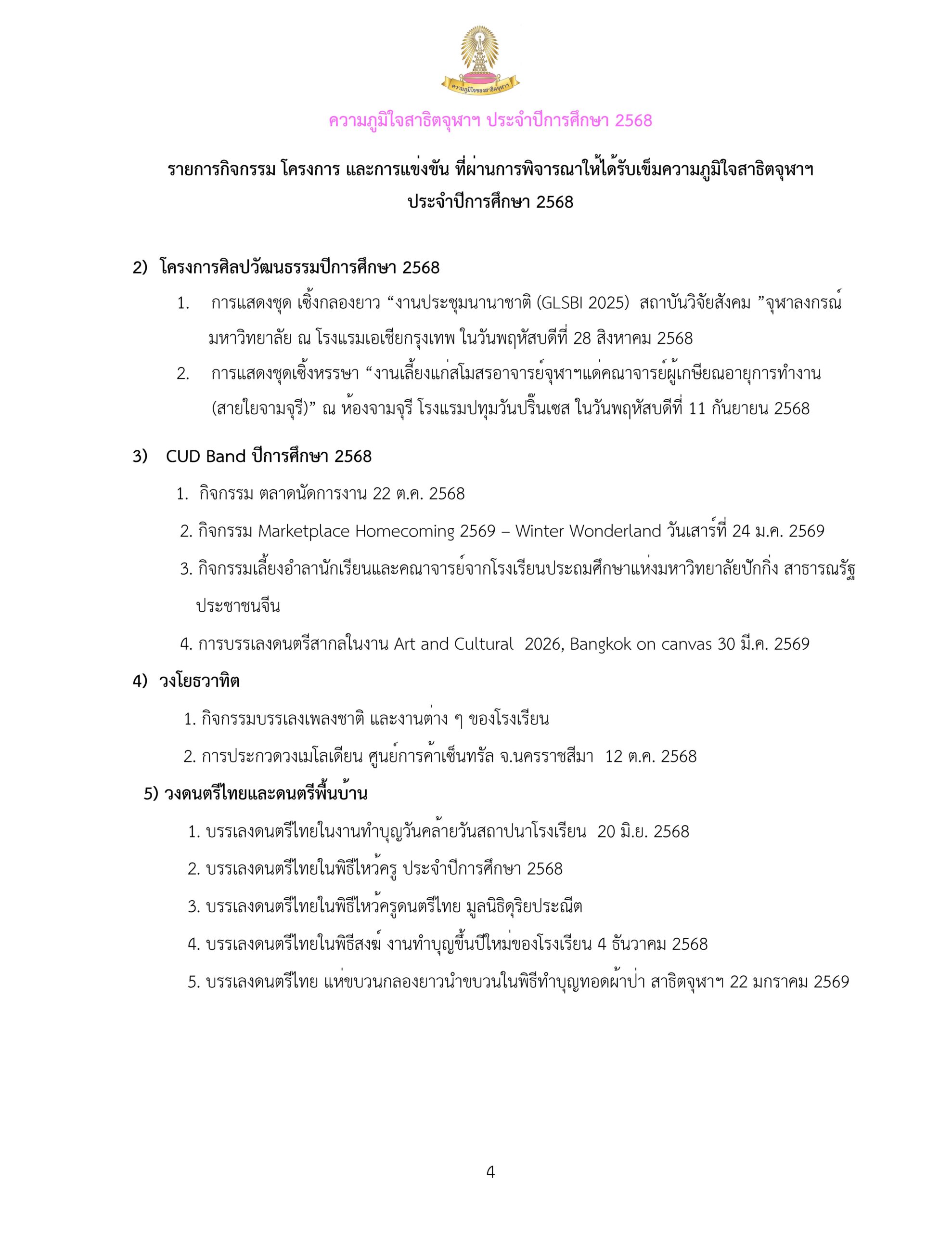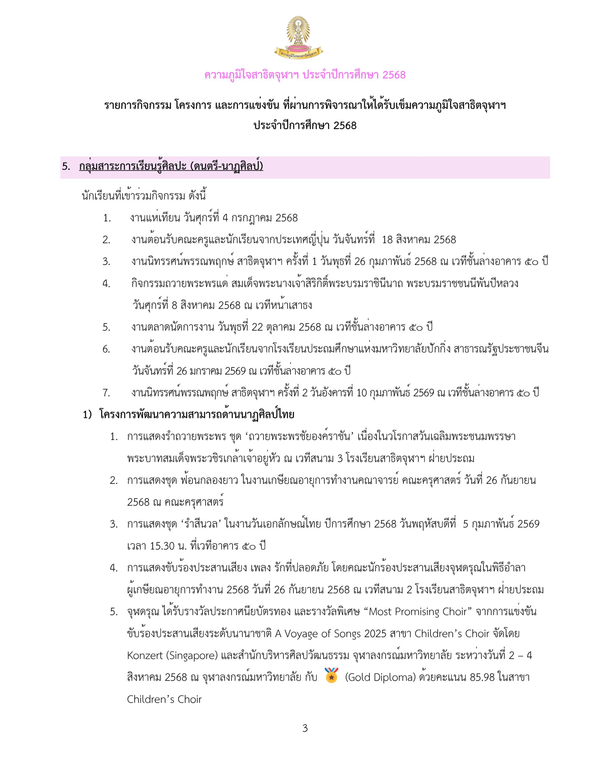 เพื่อให้เป็นวาระพิเศษในการแสดงความชื่นชมต่อนักเรียนที่เสียสละและมุ่งมั่นทำกิจกรรมเพื่อส่วนรวม สร้างชื่อเสียงให้แก่ตนเองและโรงเรียน ทางโรงเรียนจะมีการประกาศรายชื่อ รอบที่ 1 ในวันจันทร์ที่ 9 กุมภาพันธ์ 2569 บริเวณป้ายประชาสัมพันธ์ ชั้นล่างอาคาร 50 ปี สาธิตจุฬาฯ
