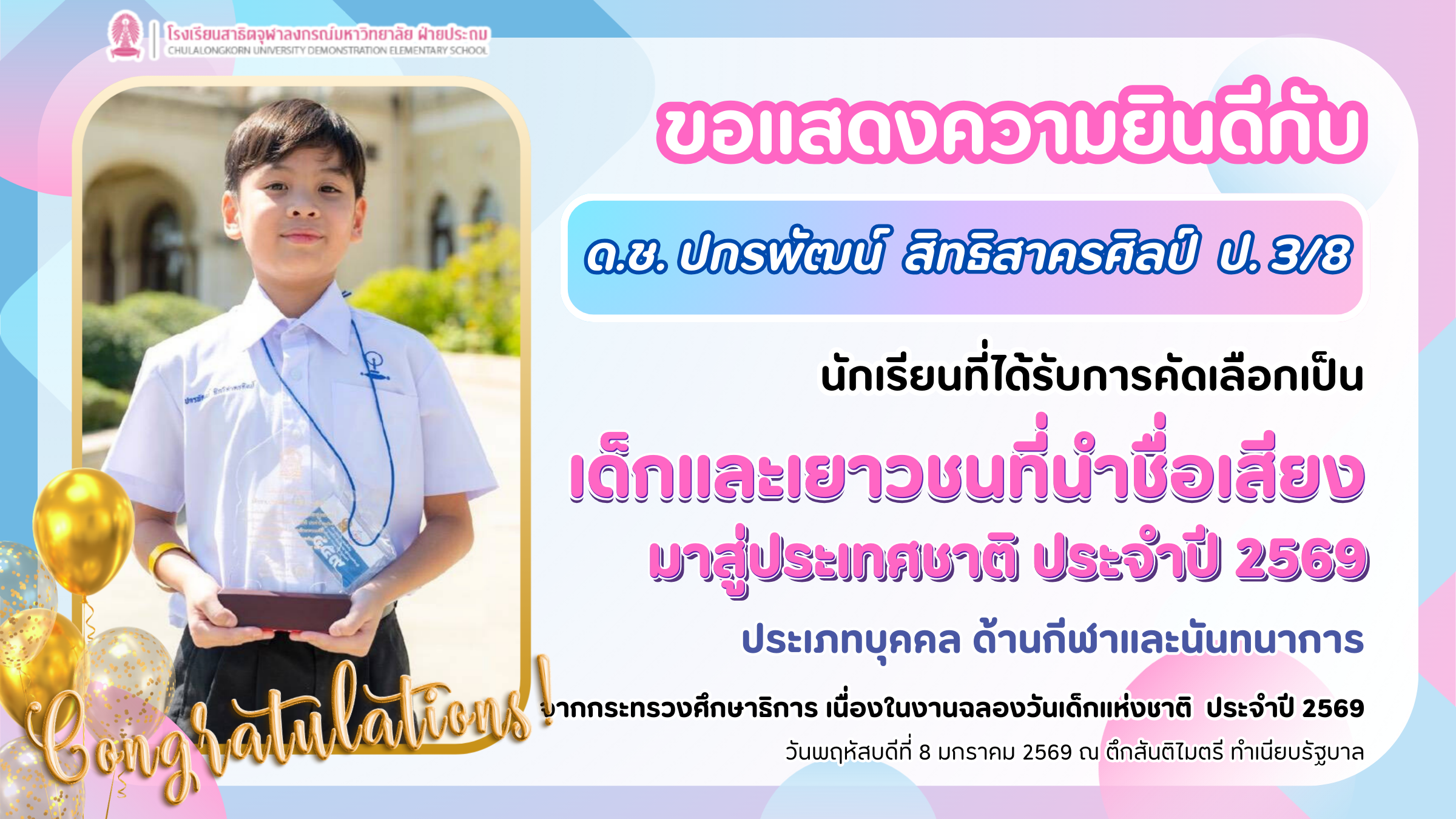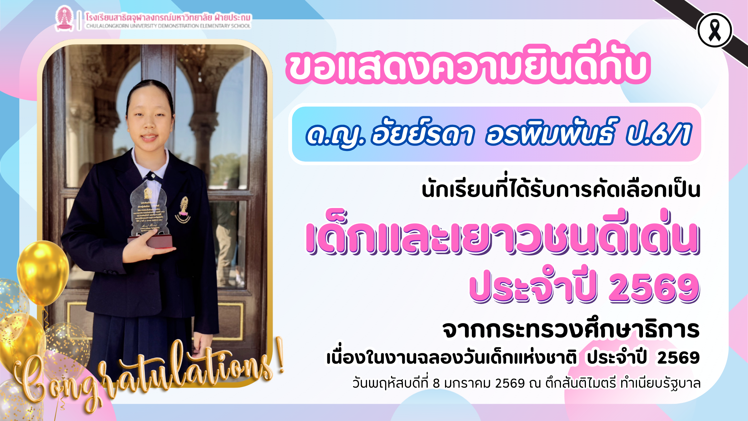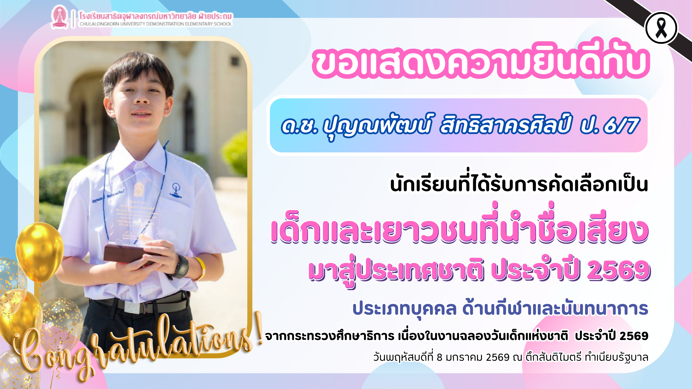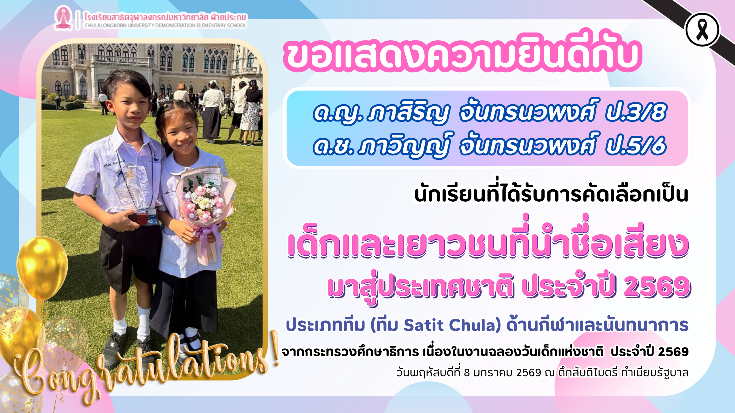 ขอแสดงความยินดีกับนักเรียนโรงเรียนสาธิตจุฬาฯ ฝ่ายประถม ที่ได้รับการคัดเลือกเป็น “เด็กและเยาวชนที่นำชื่อเสียง มาสู่ประเทศชาติ ประจำปี 2569” จากกระทรวงศึกษาธิการ เนื่องในงานฉลองวันเด็กแห่งชาติ ประจำปี 2569