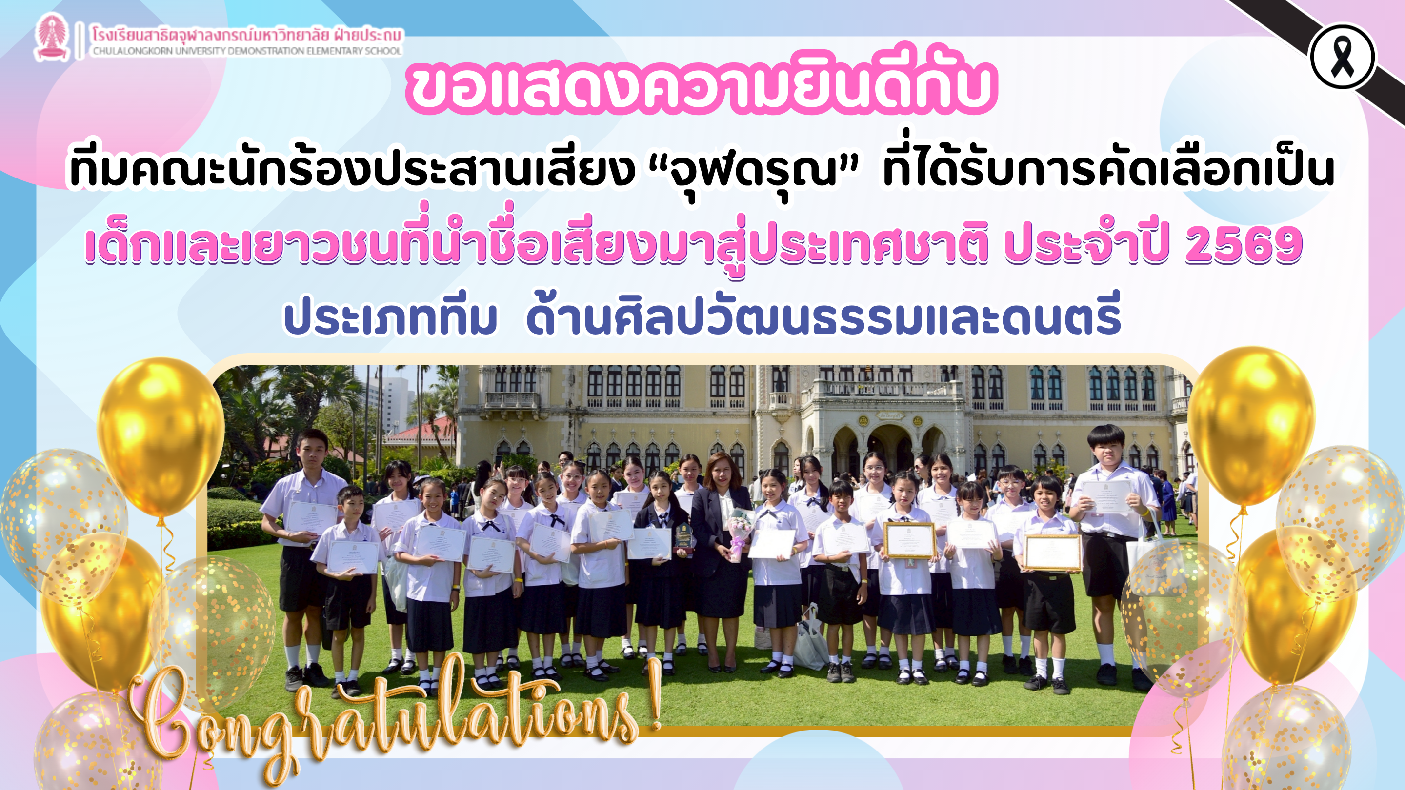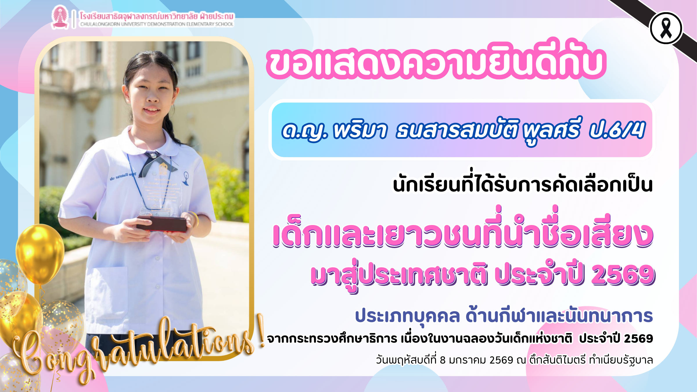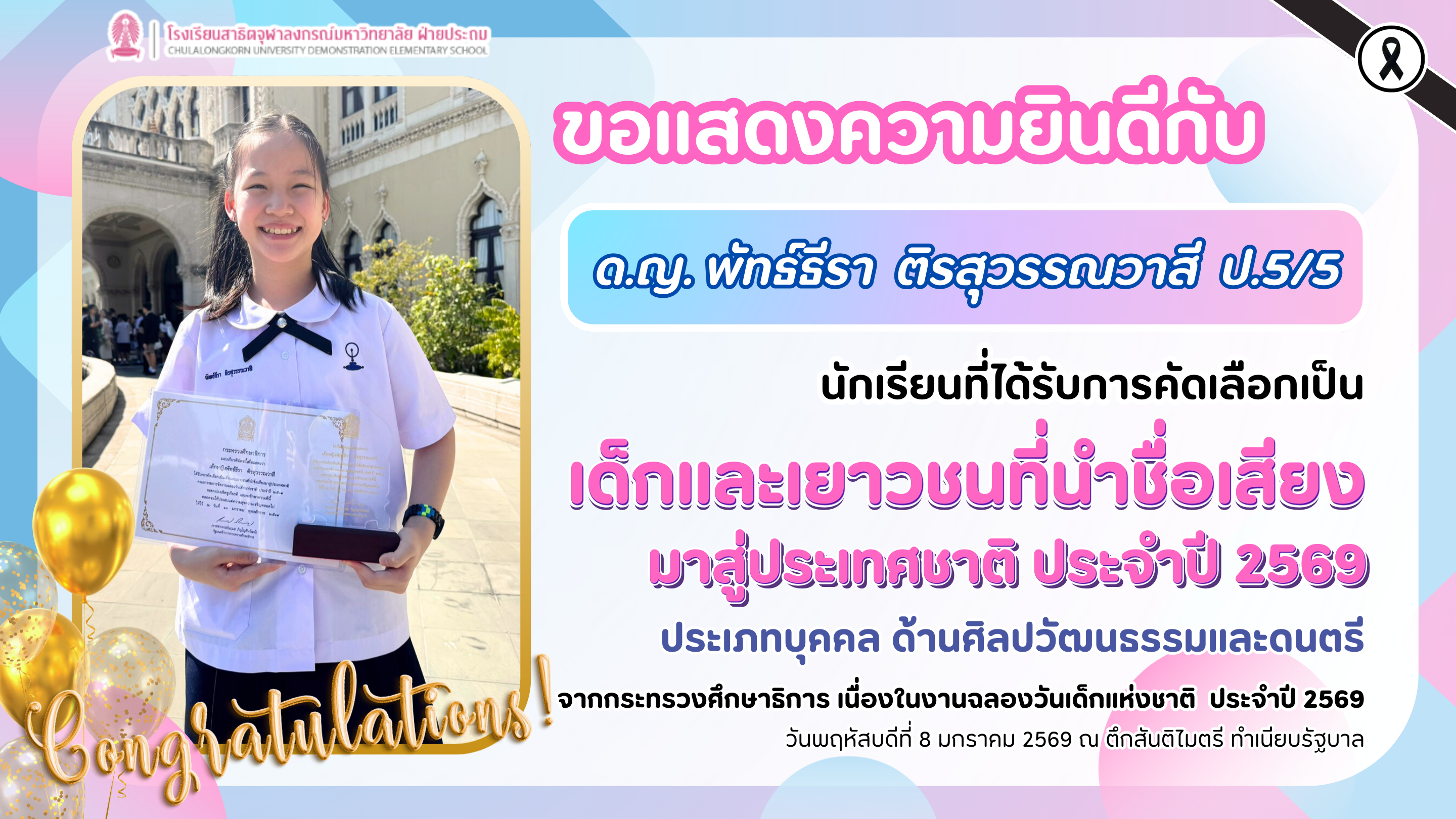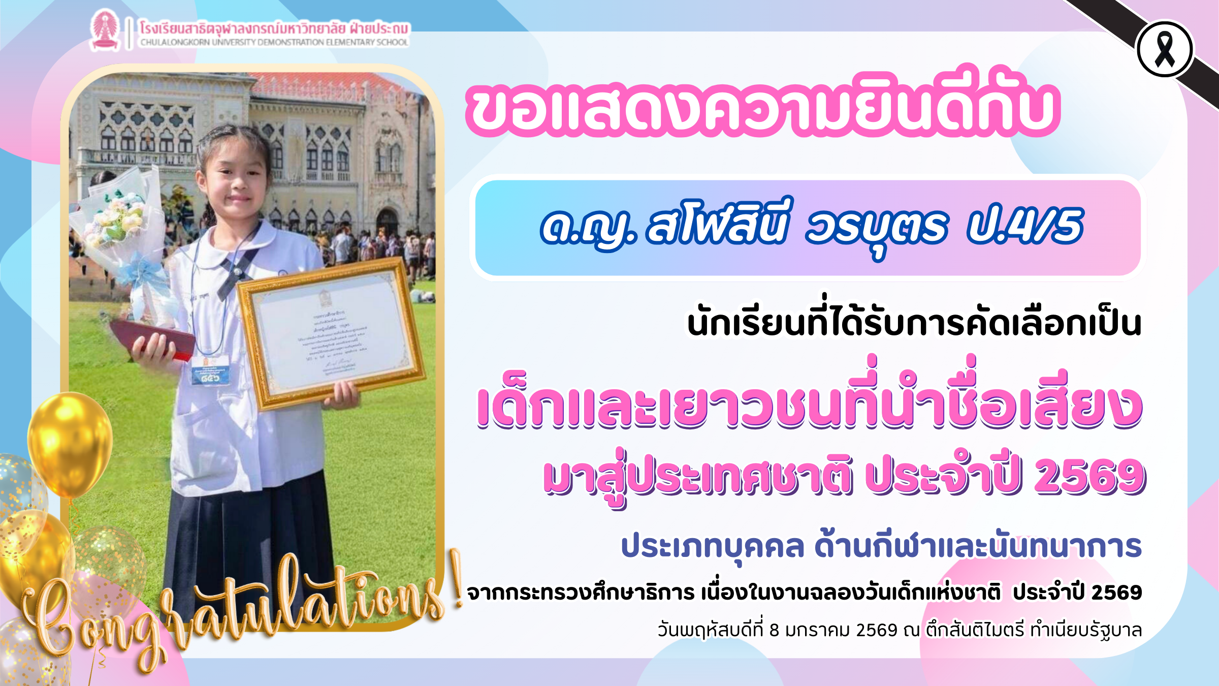 ขอแสดงความยินดีกับนักเรียนโรงเรียนสาธิตจุฬาฯ ฝ่ายประถม ที่ได้รับการคัดเลือกเป็น “เด็กและเยาวชนที่นำชื่อเสียง มาสู่ประเทศชาติ ประจำปี 2569” จากกระทรวงศึกษาธิการ เนื่องในงานฉลองวันเด็กแห่งชาติ ประจำปี 2569