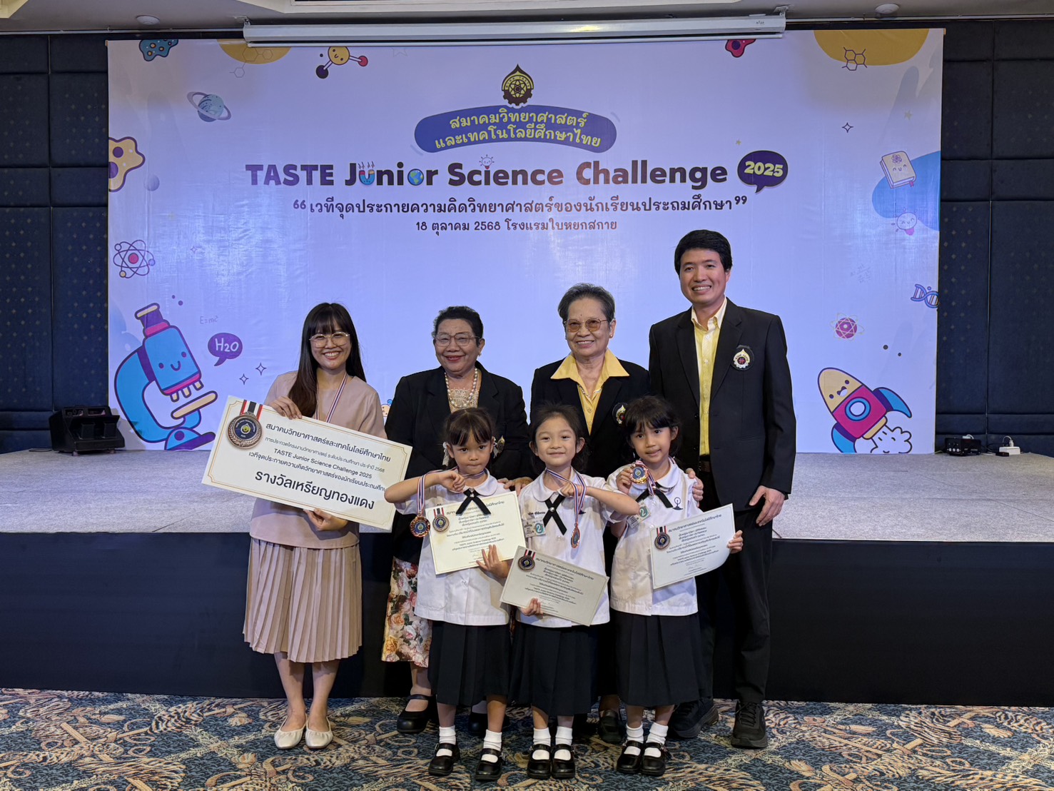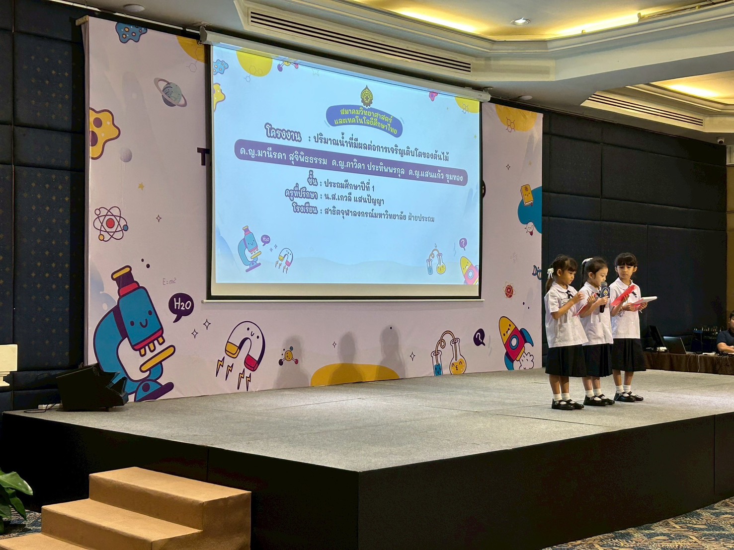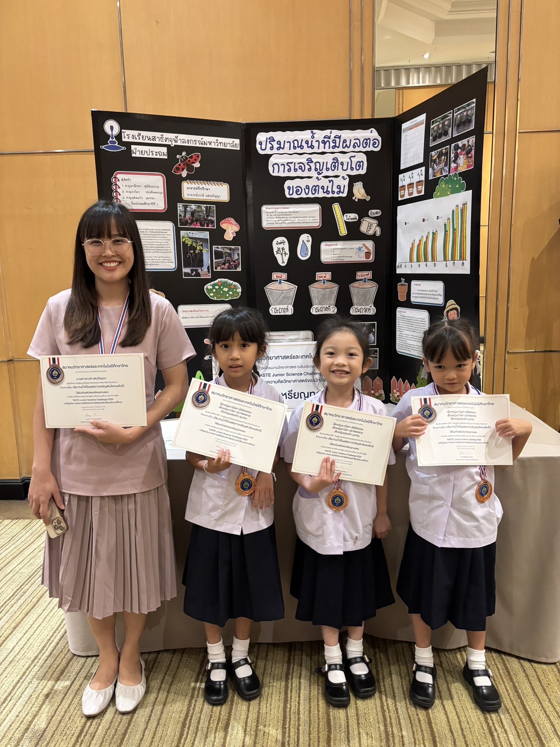 โดยมีอาจารย์เกวลี แสนปัญญา อาจารย์ที่ปรึกษาโครงการฯ และนักเรียนผู้นำเสนอโครงงานจากระดับชั้นประถมศึกษาปีที่ 1 จำนวน 3 คน เข้าร่วมนำเสนอโครงงาน “ปริมาณน้ำที่มีผลต่อการเจริญเติบโตของต้นไม้” เมื่อวันเสาร์ที่ 18 ตุลาคม 2568 ณ โรงแรม ใบหยกสกาย ที่จัดขึ้นโดยสมาคมวิทยาศาสตร์และเทคโนโลยีศึกษาไทย