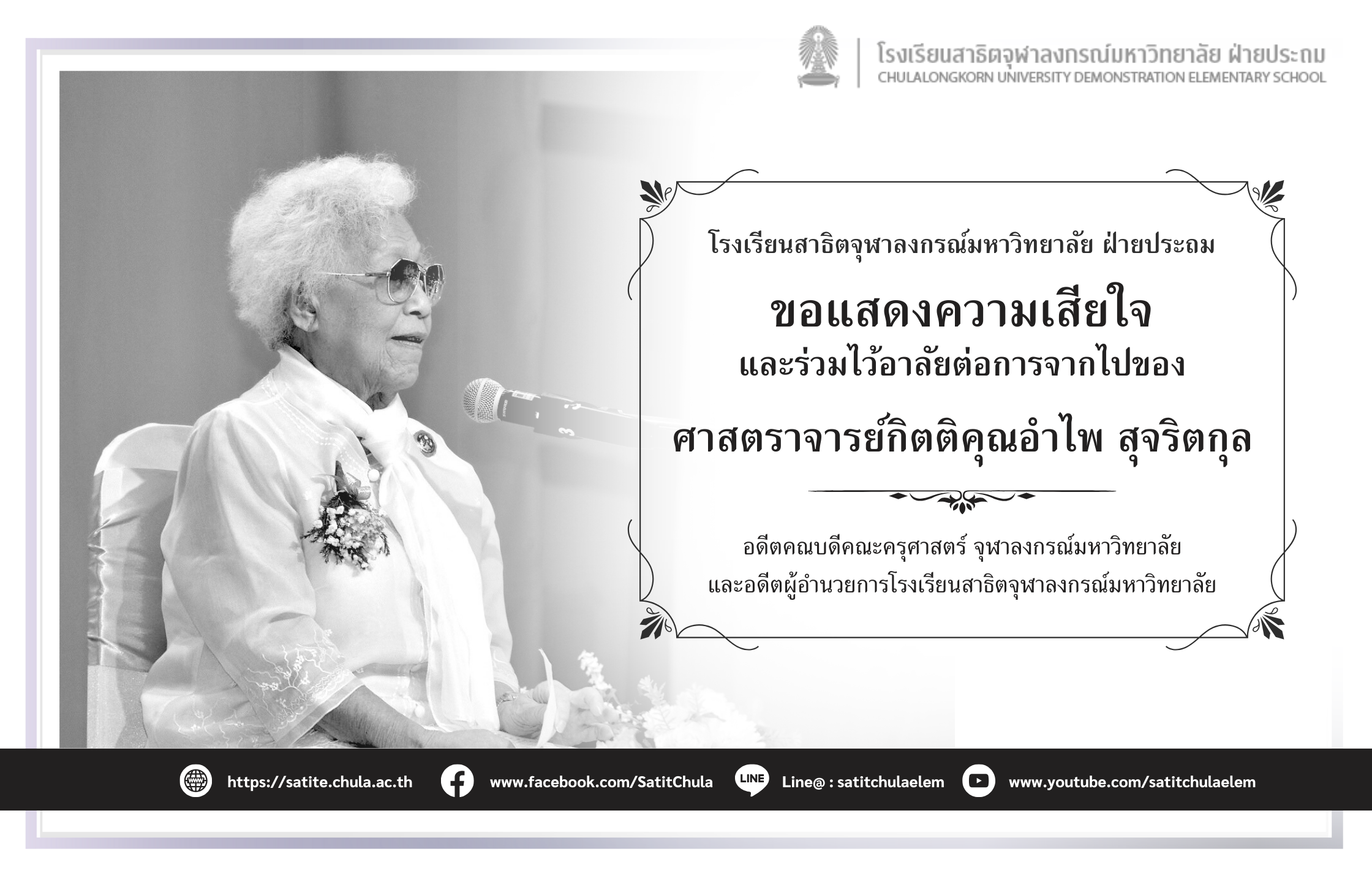 โรงเรียนสาธิตจุฬาลงกรณ์มหาวิทยาลัย ฝ่ายประถม ขอแสดงความเสียใจและร่วมไว้อาลัยต่อการจากไปของ ศาสตราจารย์กิตติคุณอำไพ สุจริตกุล อดีตคณบดีคณะครุศาสตร์ จุฬาลงกรณ์มหาวิทยาลัย และอดีตผู้อำนวยการโรงเรียนสาธิตจุฬาลงกรณ์มหาวิทยาลัย By Web Master|2023-09-26T18:58:17+07:00September 26, 2023|ข่าวประชาสัมพันธ์| View Larger Image โรงเรียนสาธิตจุฬาลงกรณ์มหาวิทยาลัย ฝ่ายประถม ขอแสดงความเสียใจและร่วมไว้อาลัยต่อการจากไปของ ศาสตราจารย์กิตติคุณอำไพ สุจริตกุล อดีตคณบดีคณะครุศาสตร์ จุฬาลงกรณ์มหาวิทยาลัย และอดีตผู้อำนวยการโรงเรียนสาธิตจุฬาลงกรณ์มหาวิทยาลัย