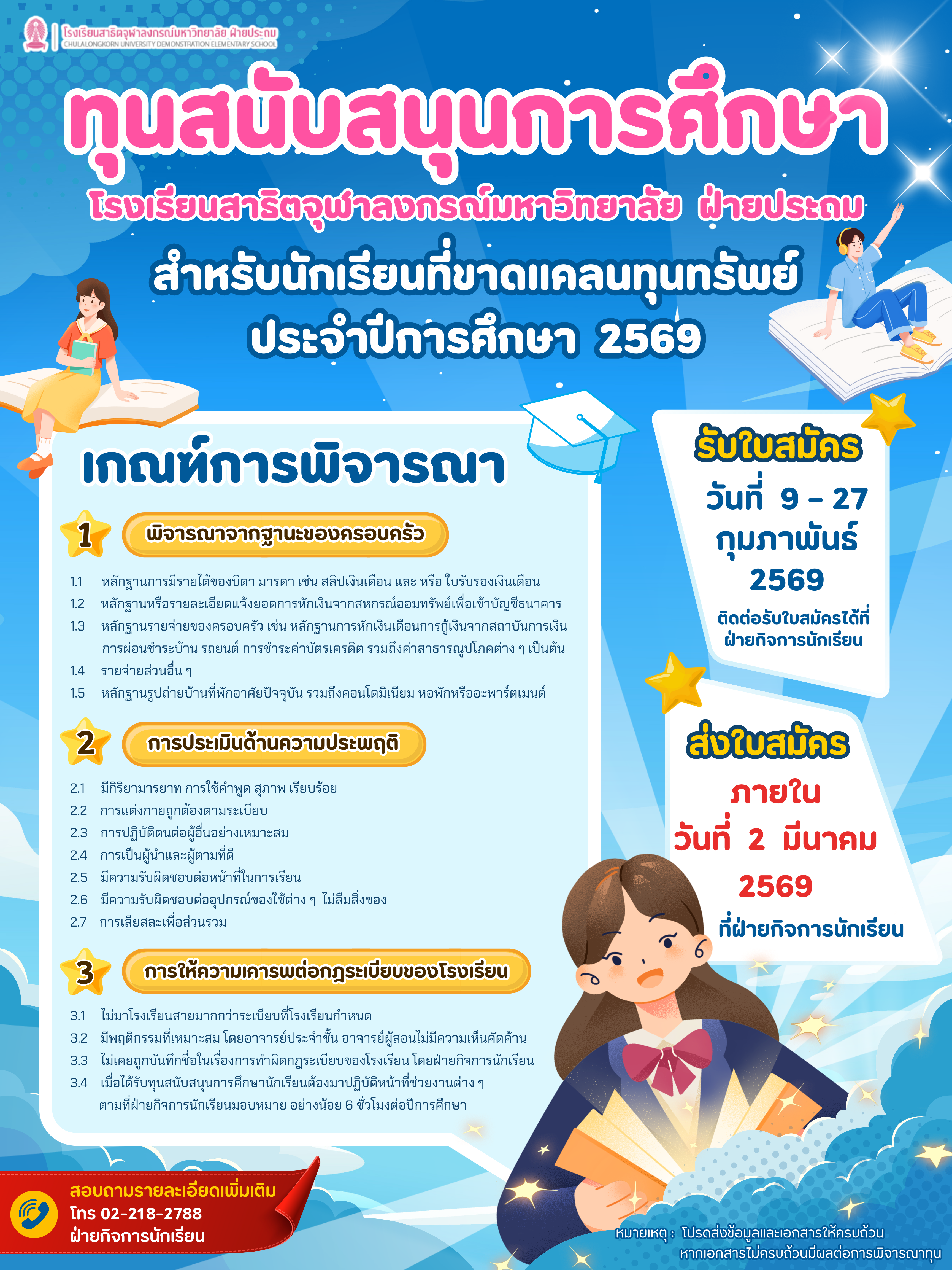 ฝ่ายกิจการนักเรียน โรงเรียนสาธิตจุฬาลงกรณ์มหาวิทยาลัย ฝ่ายประถม เปิดรับสมัครทุนสนับสนุนการศึกษาสำหรับนักเรียนโรงเรียนสาธิตจุฬาลงกรณ์มหาวิทยาลัย ฝ่ายประถม ที่ขาดแคลนทุนทรัพย์ ปีการศึกษา 2569Web Master2026-02-06T12:48:30+07:00February 6, 2026|Read More